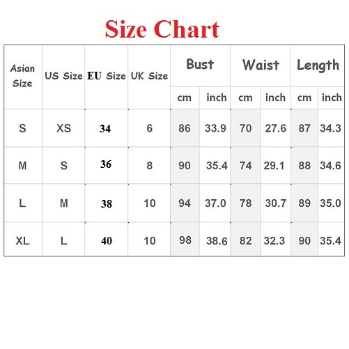 XL : Bust : 98cm(38.58"); Waist : 82cm(32.28"); Length : 90cm(35.43");