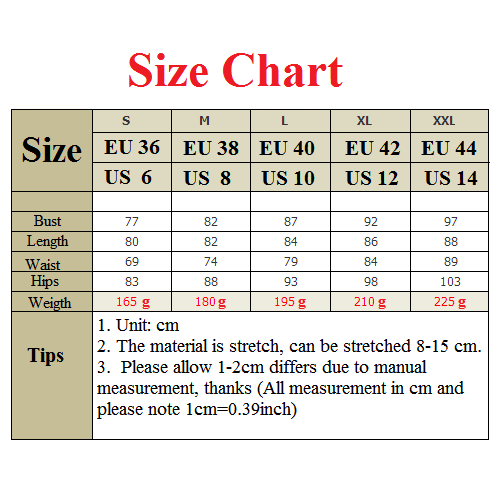 XL : Bust : 92cm(36.22"); Waist : 84cm(33.07"); Hips : 98cm(38.58"); Length : 86cm(33.86");