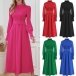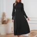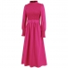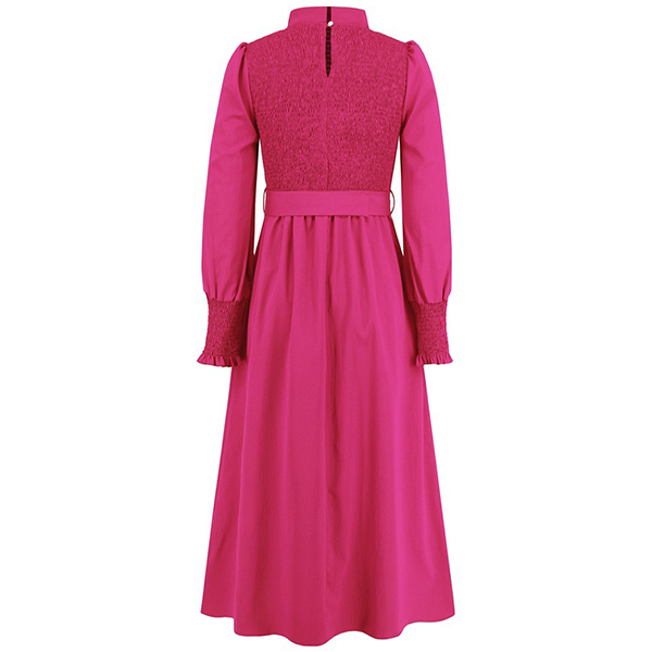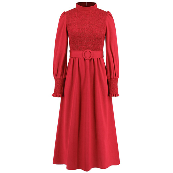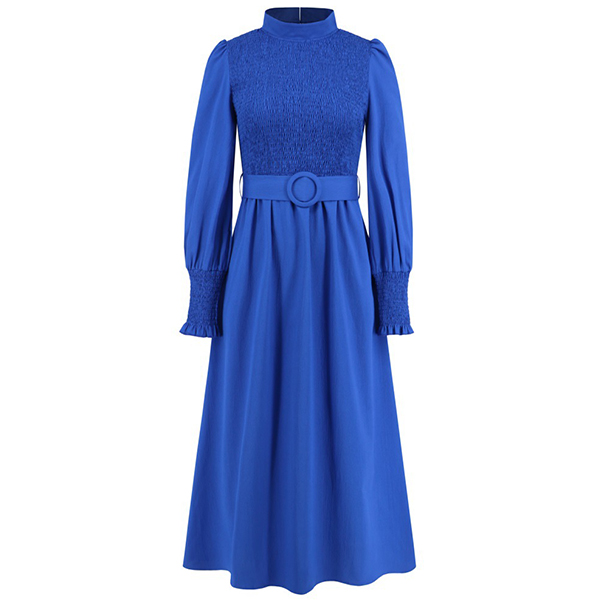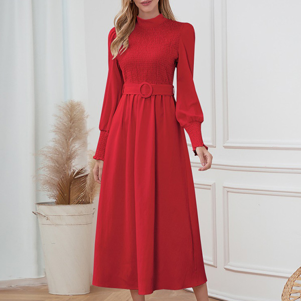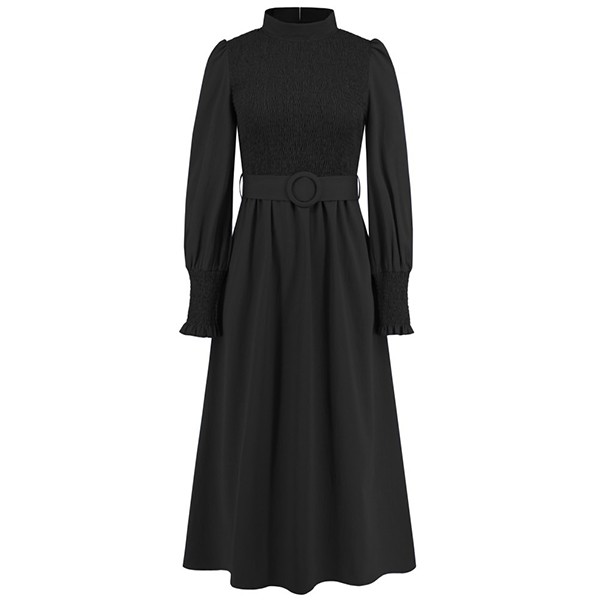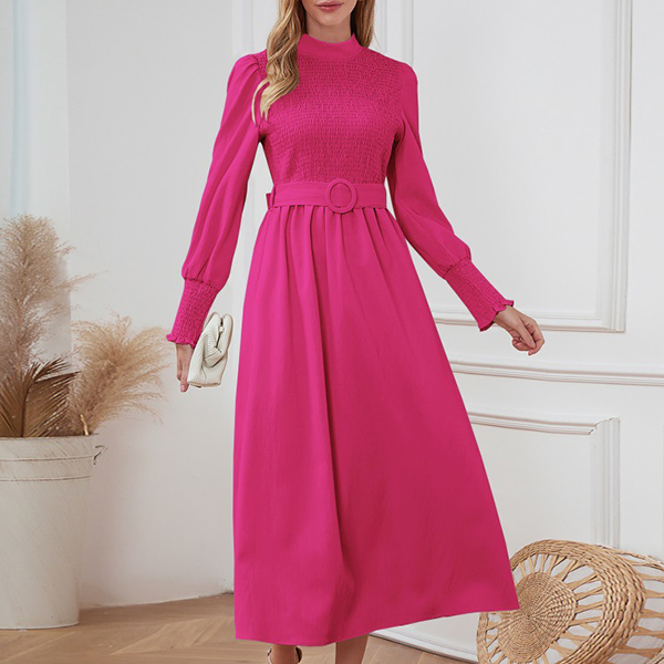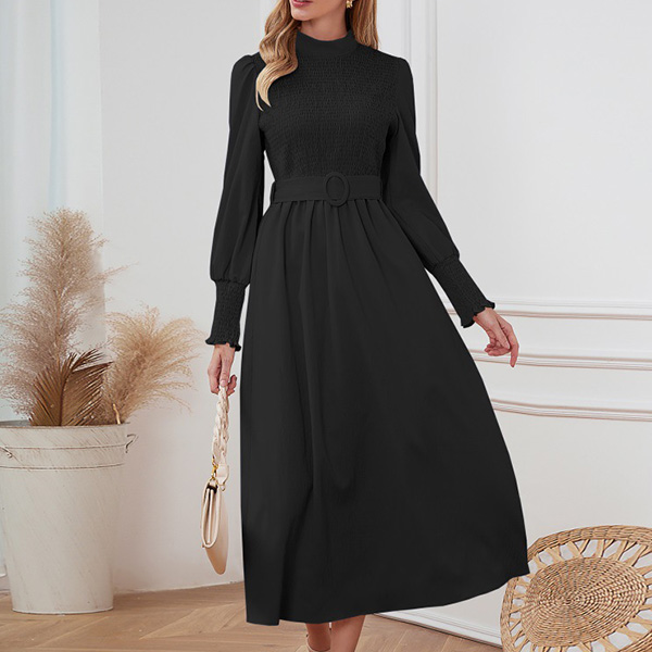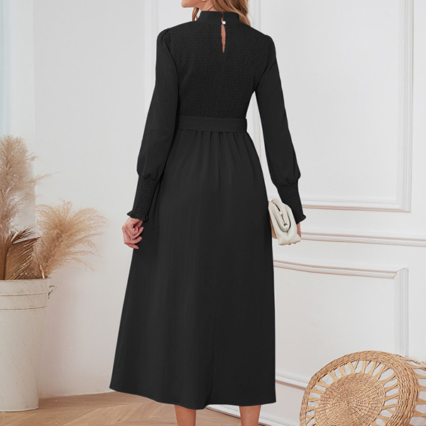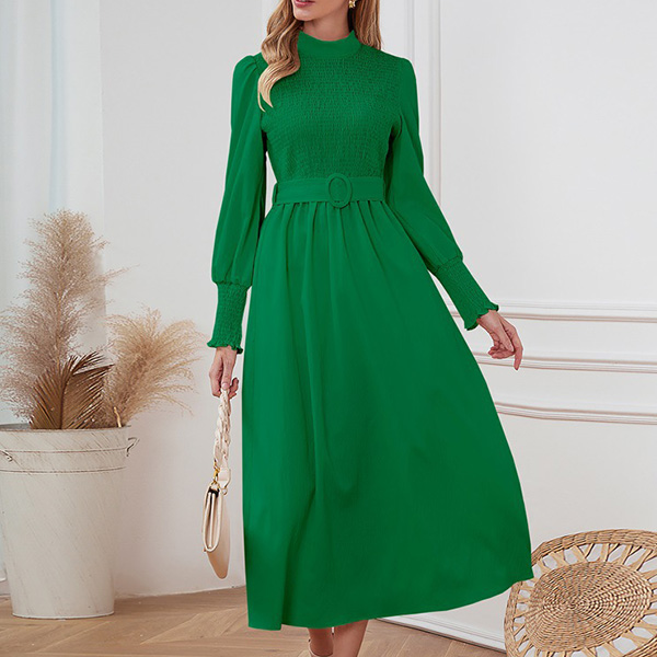Elegant Solid Color Smocked Mock Neck Long Sleeve Midi Dress with Belt