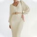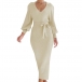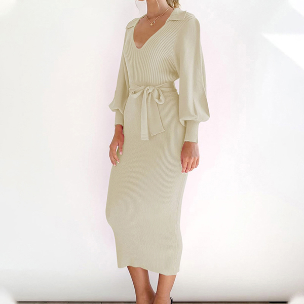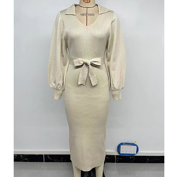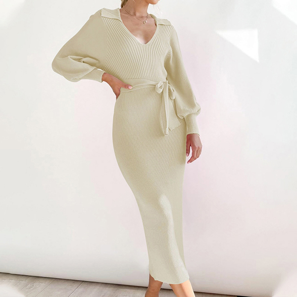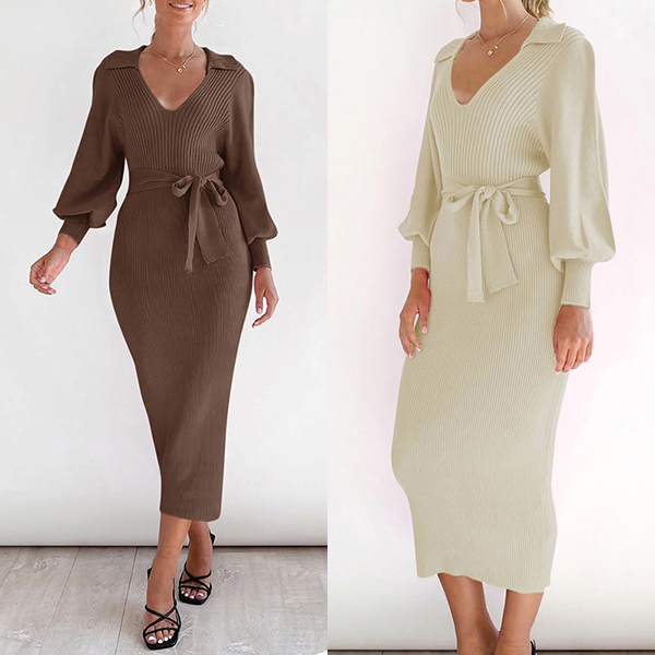 This polished ribbed dress features a structured stand collar V-neck that frames the face beautifully while adding architectural interest to the sleek silhouette. Long sleeves provide classic coverage and reliable warmth, and the thoughtful self-tie detail creates customizable definition at the waist, allowing you to accentuate your figure or wear more relaxed as desired. The ribbed construction delivers subtle textural interest with flattering vertical lines that create a lengthening effect throughout the body. Perfect for daily wear.