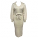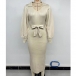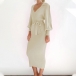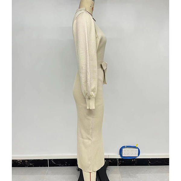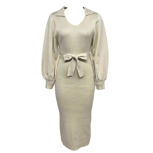 Elegant Solid Color Stand Collar Long Sleeve Self-tie Ribbed Sweater Dress