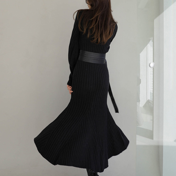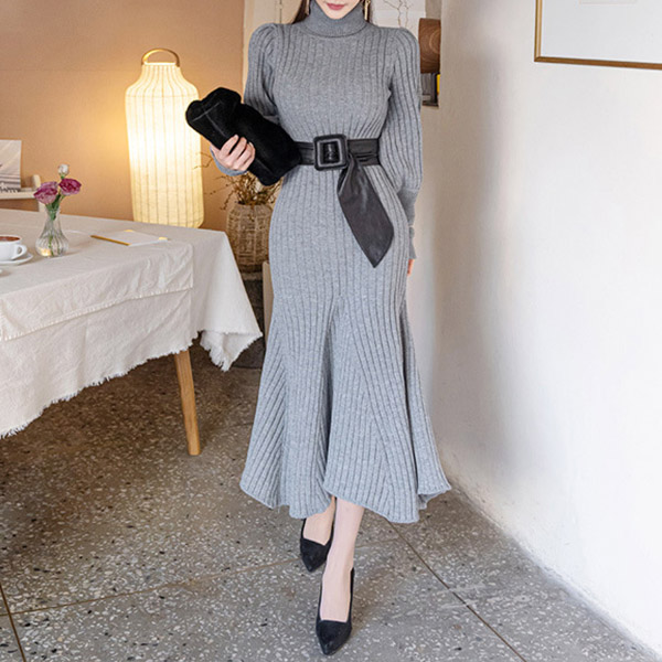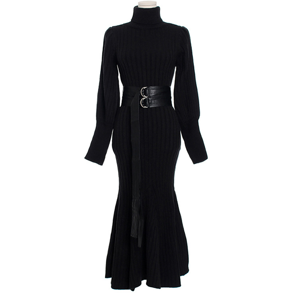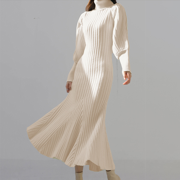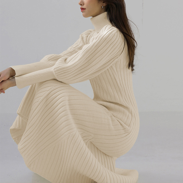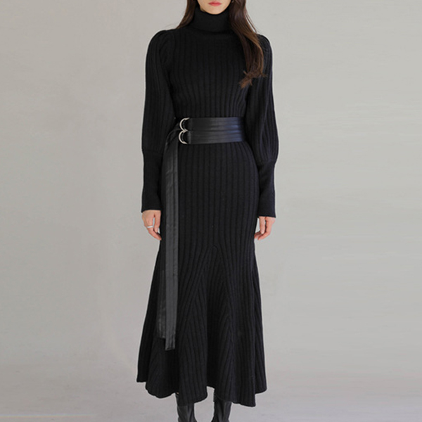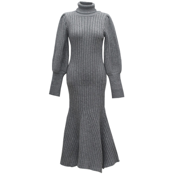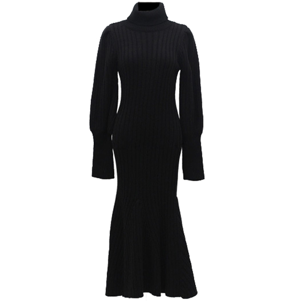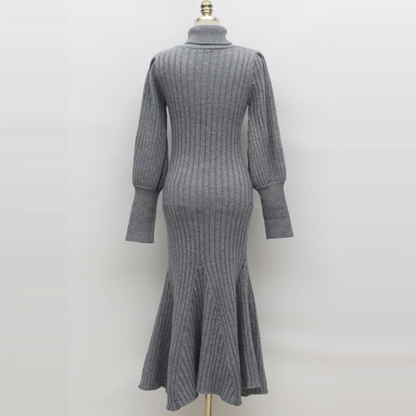 This elegant, Ribbed fishtail dress is sure to turn heads! The turtleneck provides a touch of sophistication, while the long sleeves and fishtail hem add a touch of drama. The ribbed texture adds interest and texture, while the stretchy fabric ensures a comfortable and flattering fit.
