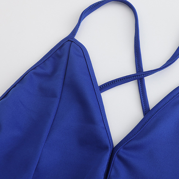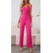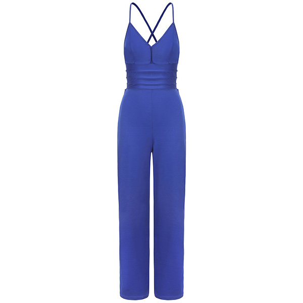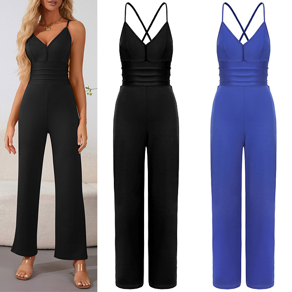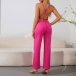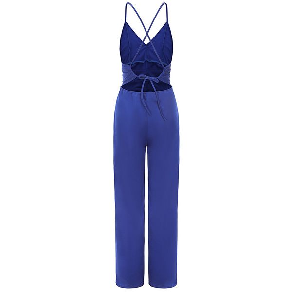 This jumpsuit features V-neckline, high-rise waistline, cross-criss backless detailing, and straight-cut silhouette, creates a garment that is both visually striking and exceptionally comfortable to wear. Crafted from a high-quality, solid-colored fabric, this garment exudes a sense of refined sophistication and timeless style.