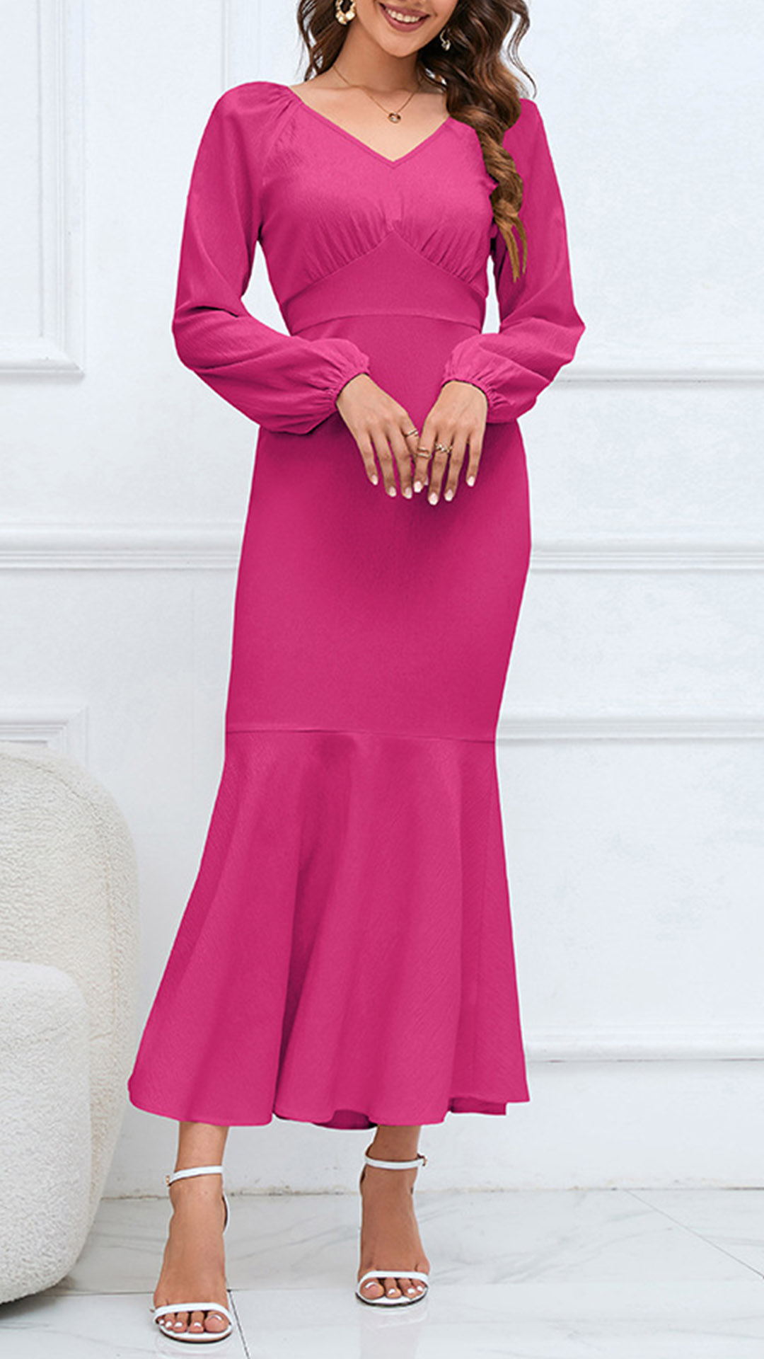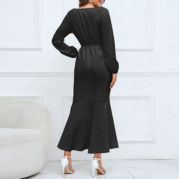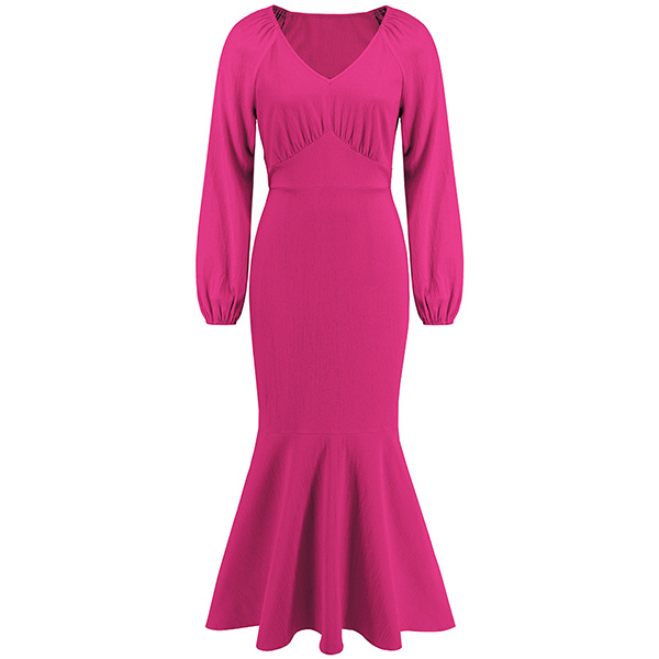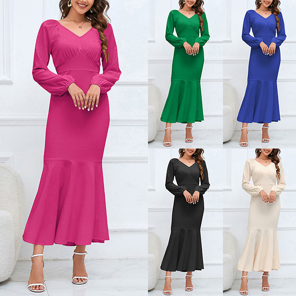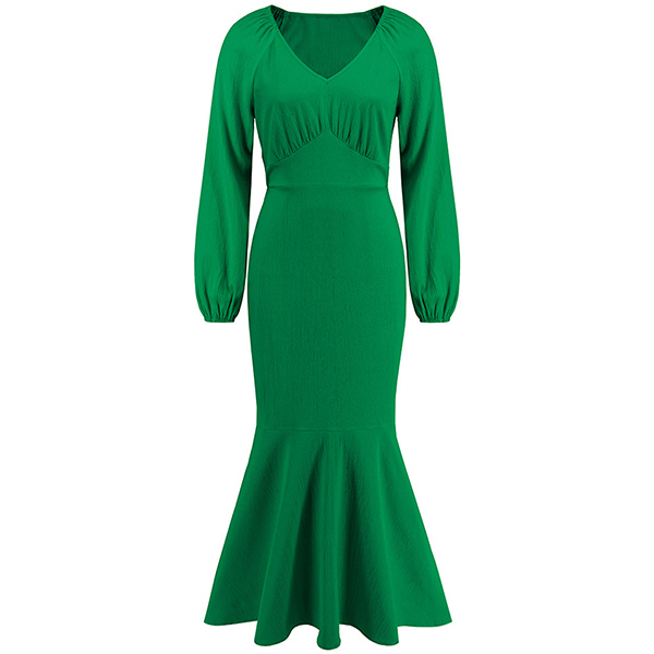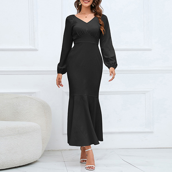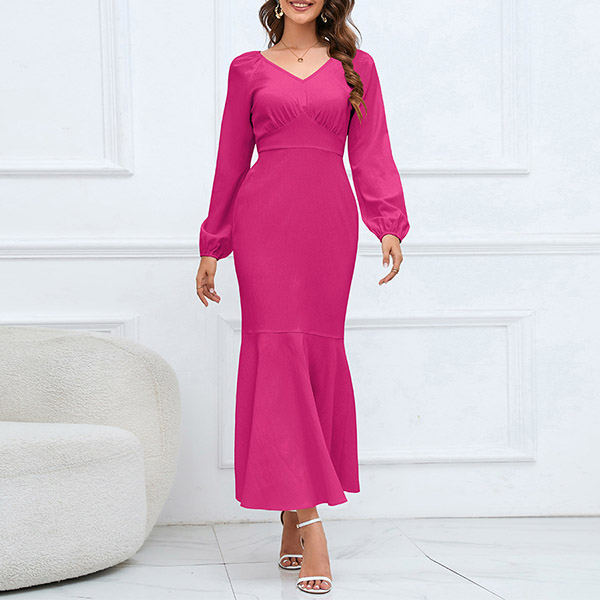 Elegant Solid Color V-neck High-rise Long Sleeve Fishtail Midi Dress