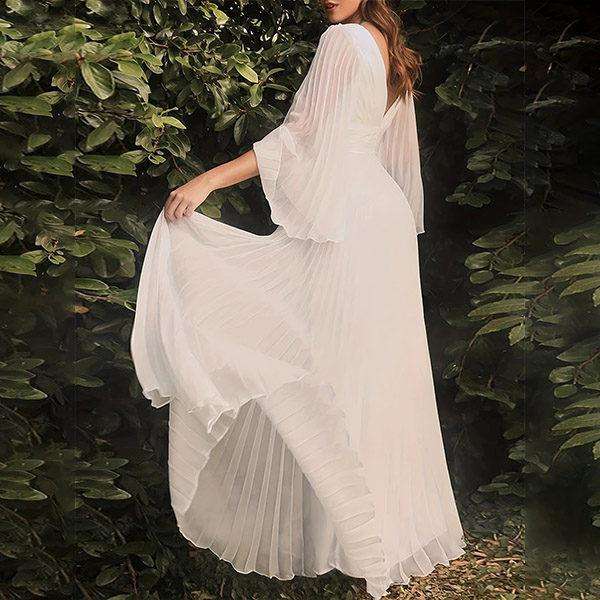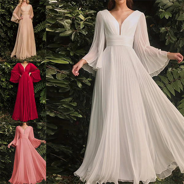 Designed to exude elegance and sophistication, this dress is perfect for formal events or parties. The solid color adds a touch of refinement, while the V-neckline elongates the neck and enhances the décolletage. The long sleeves offer a combination of coverage and style. The cinched waist creates a flattering silhouette, accentuating your curves in all the right places. The pleated maxi skirt flows gracefully as you move, adding an ethereal and romantic touch to the dress.