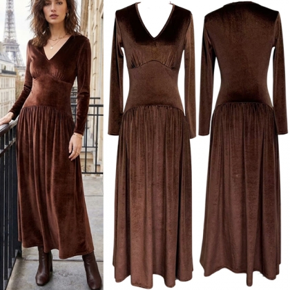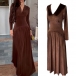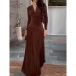 Elegant Solid Color V-neck Long Sleeve High-rise Ruched Maxi Dress