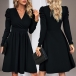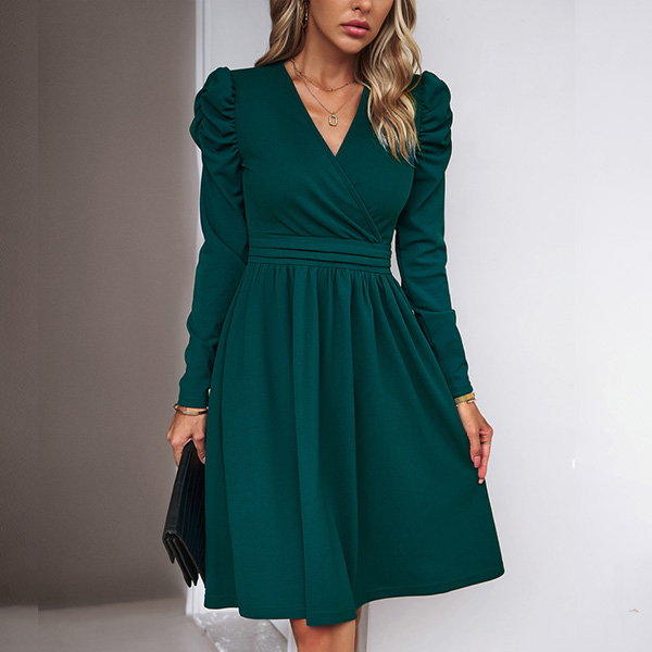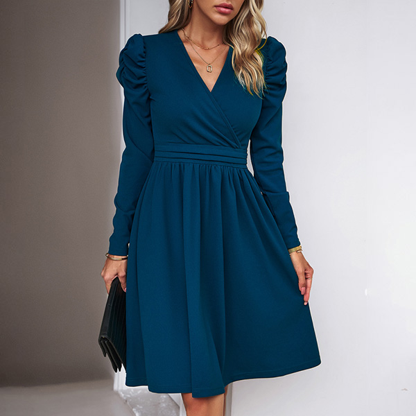 Elegant Solid Color V-neck Long Sleeve High Waist Mini Dress