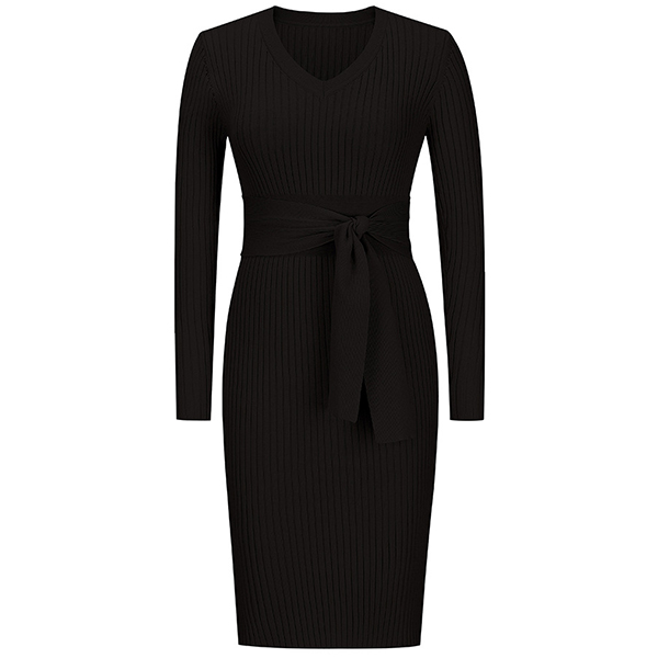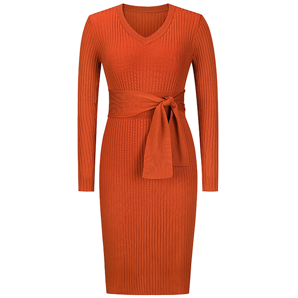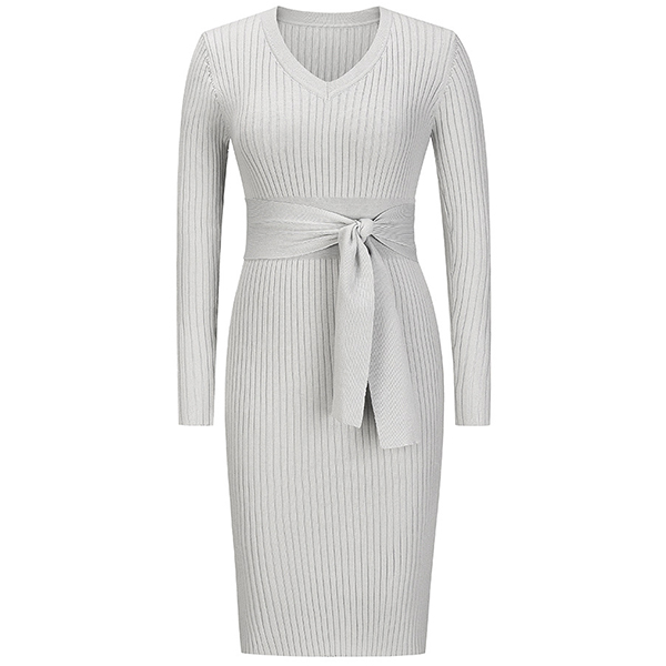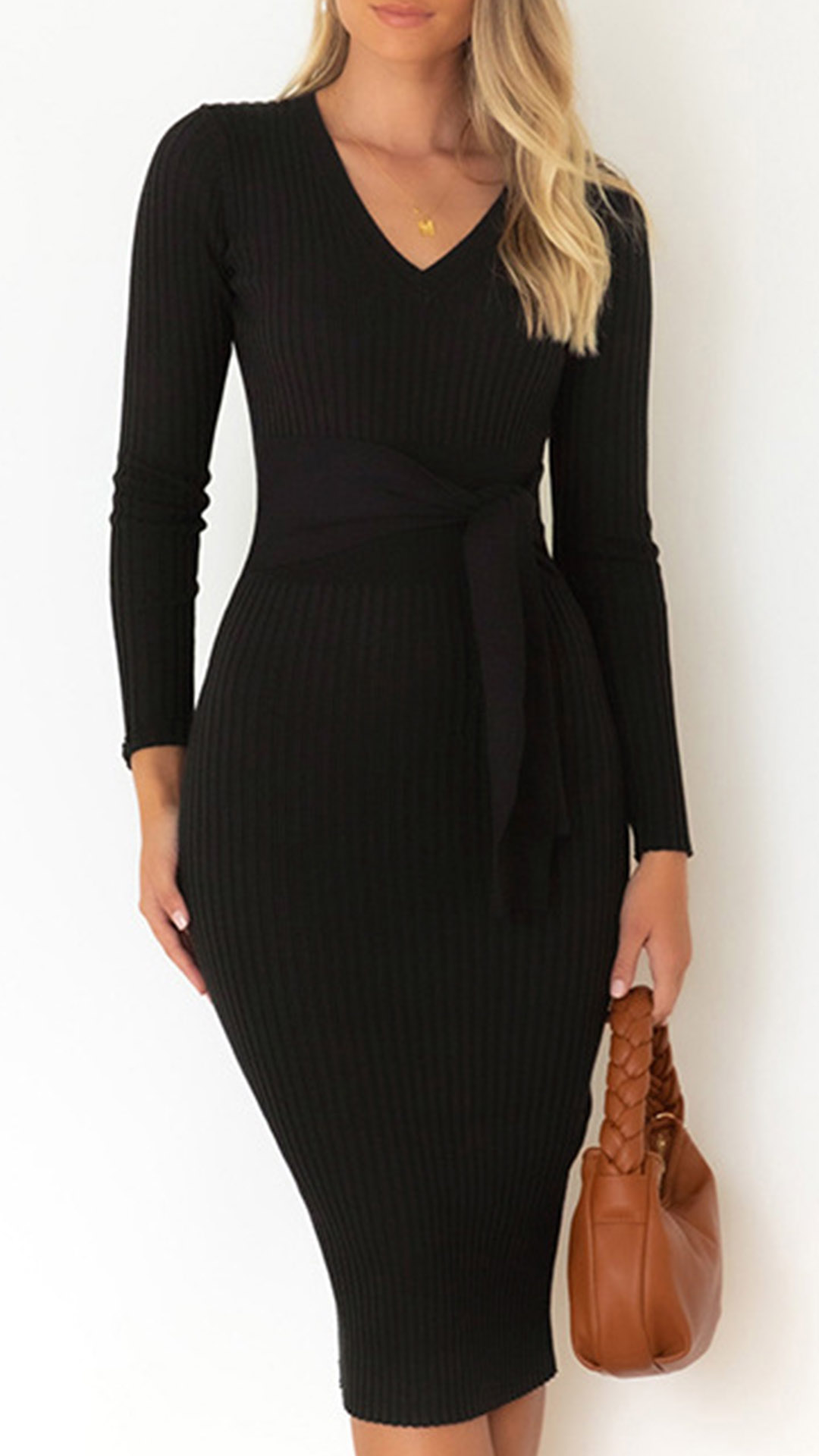 Elegant Solid Color V-neck Long Sleeve Self-tie Bodycon Knitted Midi Dress