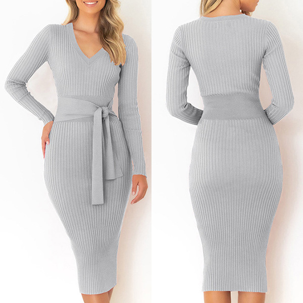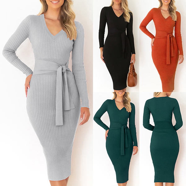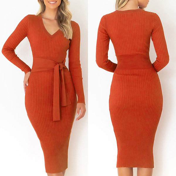 This is a must-have bodycon dress for any fashion-savvy woman. The dress is made of a high-quality knit fabric that is stretchy and comfortable. It features a V-neckline, long sleeves, and a self-tie waist that accentuates your curves. The midi length makes it perfect for both casual and formal occasions.
