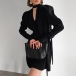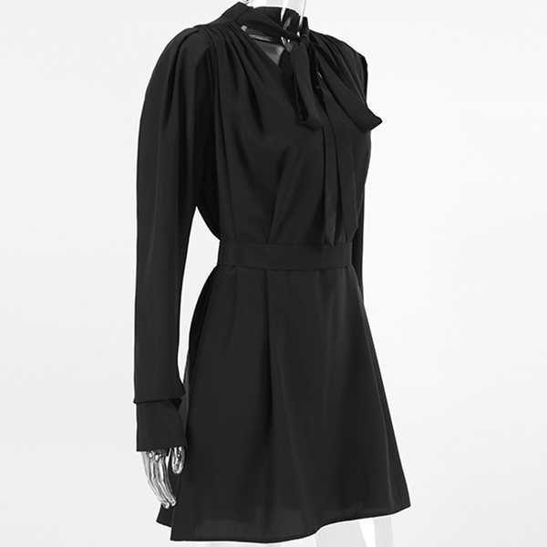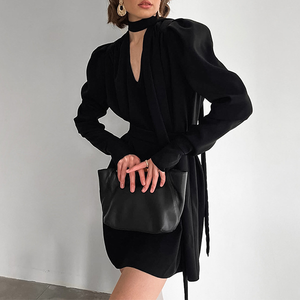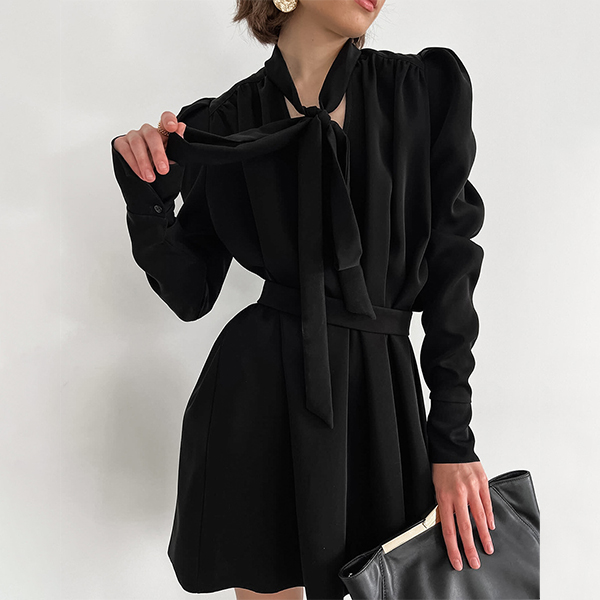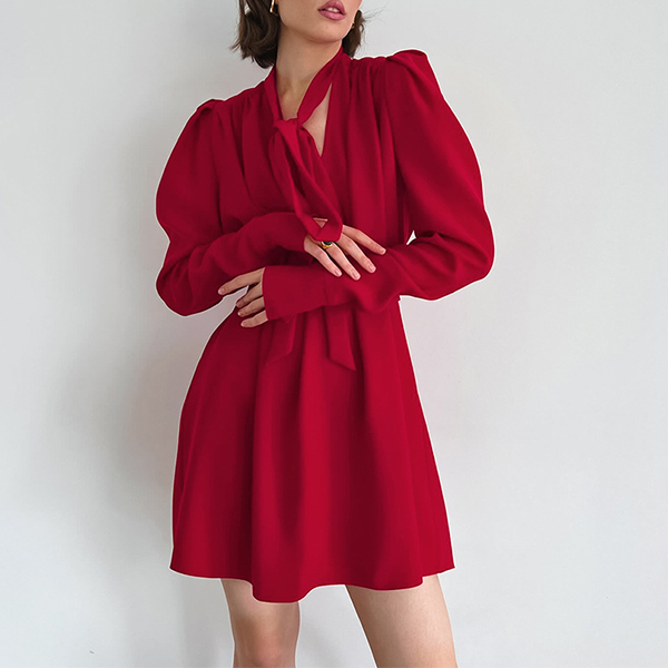 Elegant Solid Color V-neck Puff Long Sleeve High-rise Self-tie Mini Dress