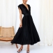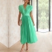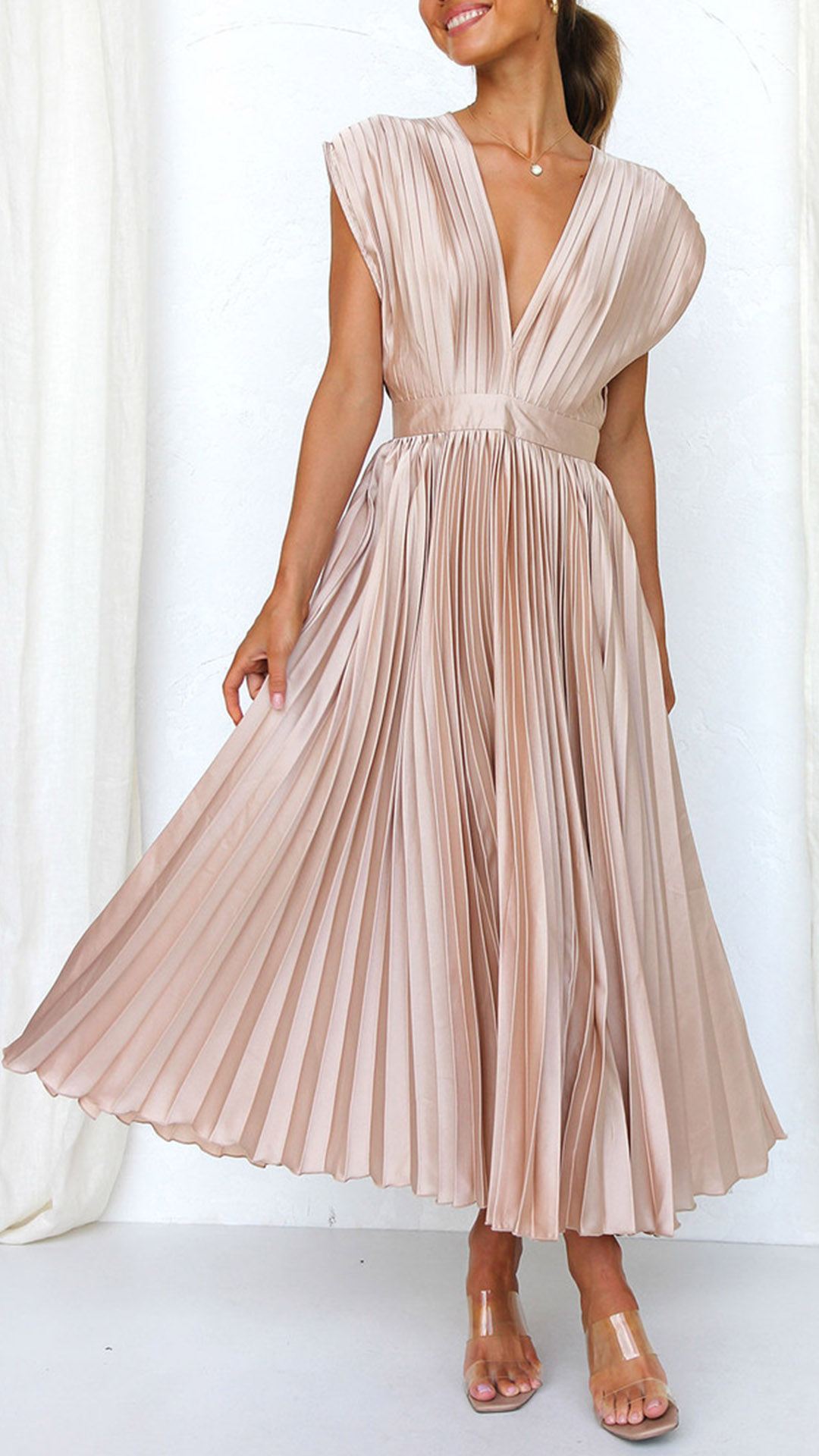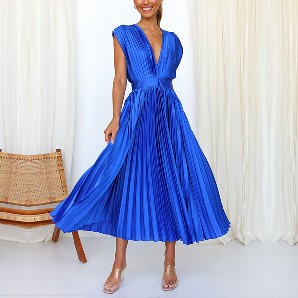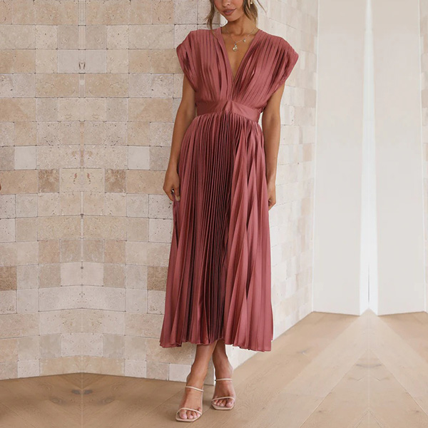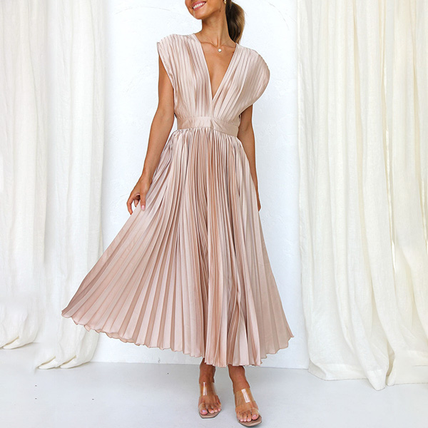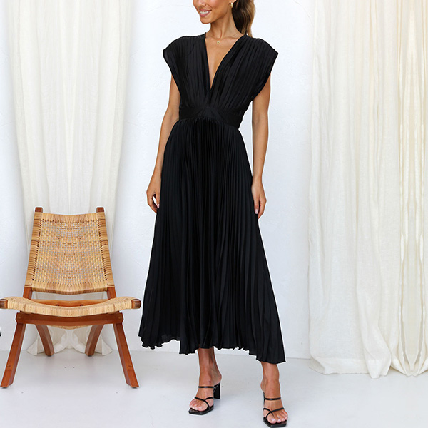 Elegant Solid Color V-neck Sleeveless Backless Pleated Midi-dress