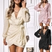 Elegant Solid Color Wave Pattern V-neck Self-tie Ruched Irregular Hemline Dress