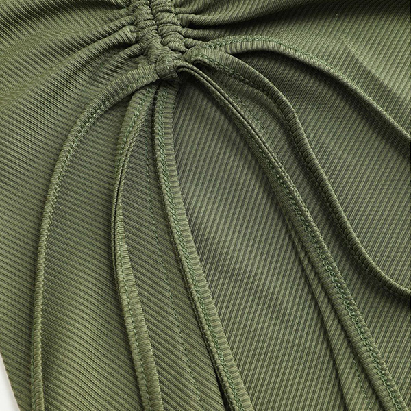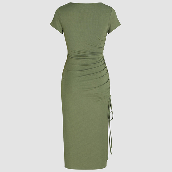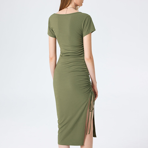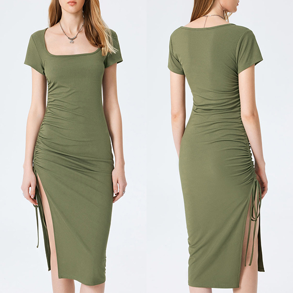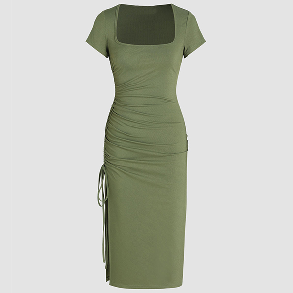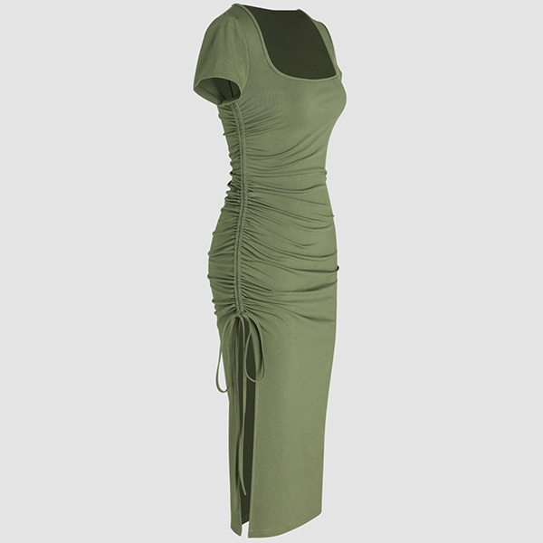 Elegant Square Neck Cap Sleeve Side Drawstring Slit Dress