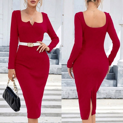 Elegant Square Neck Long Sleeve Slit Bodycon Dress