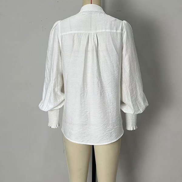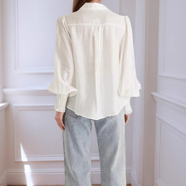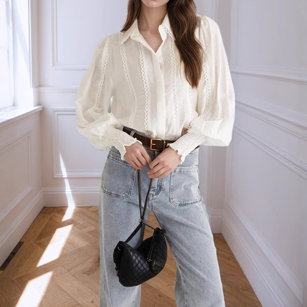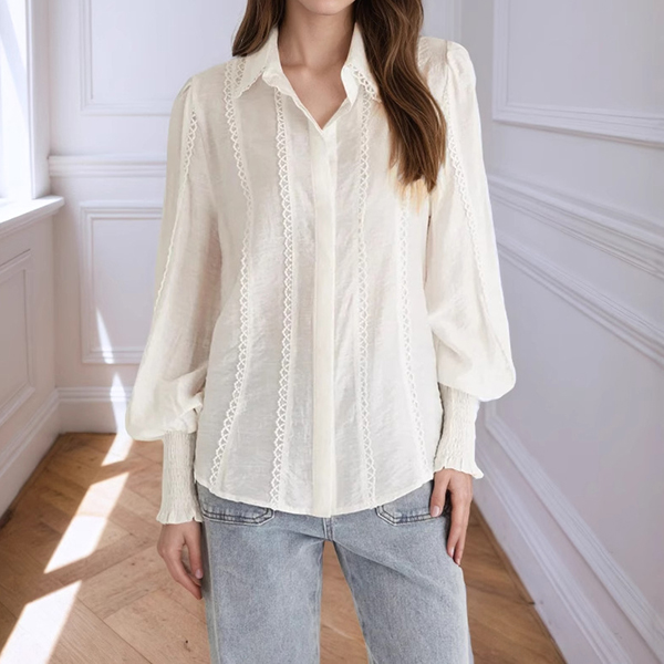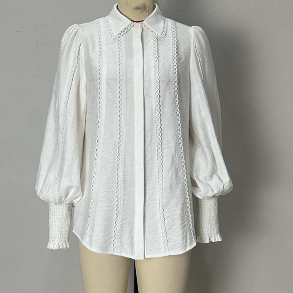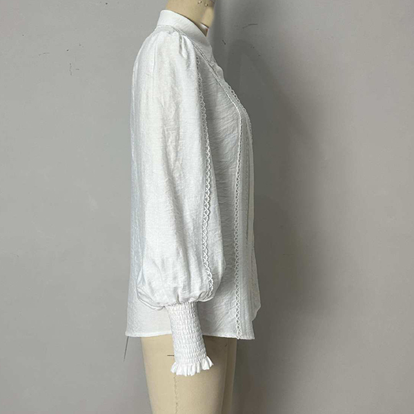 This romantic blouse embodies feminine sophistication through delicate detailing and graceful silhouette elements. The stand collar creates refined neckline structure with vintage-inspired elegance, while the lantern sleeves add dramatic volume and romantic movement that captures classic feminine appeal. The lace trim introduces delicate textural contrast and artisanal finishing that enhances the blouse's refined character, and the crisp white foundation provides timeless versatility and fresh sophistication. Style it with tailored bottoms for coordinated refinement, pair with flowing skirts to embrace the romantic aesthetic.