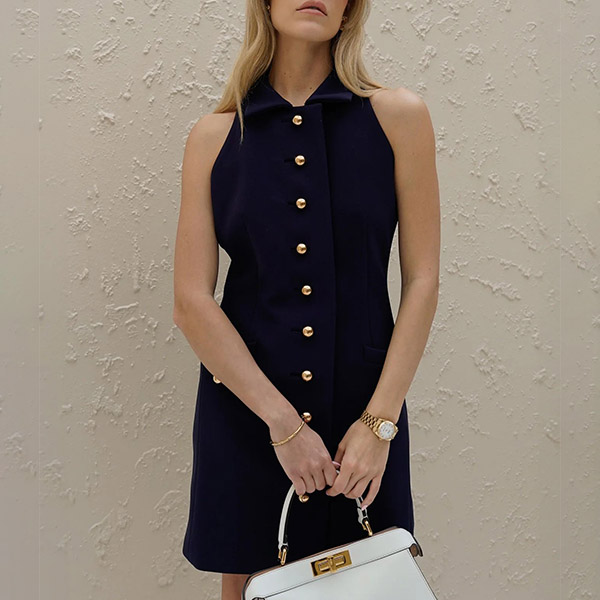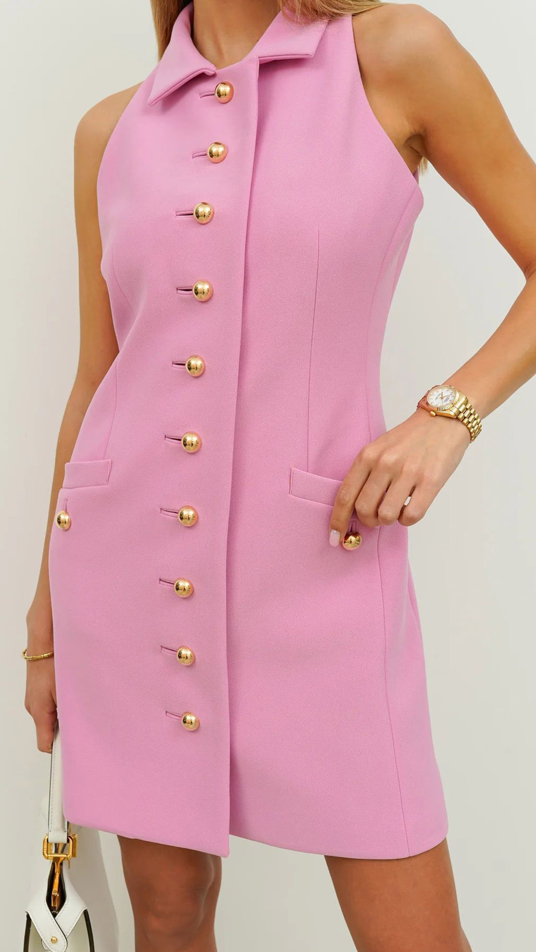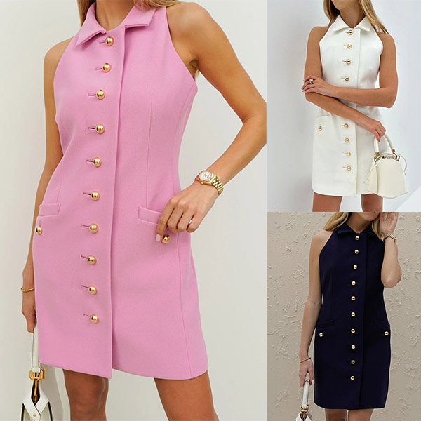 This elegant dress features a stand collar, sleeveless design, front button closure, and suit-inspired details for an elegant and professional look.