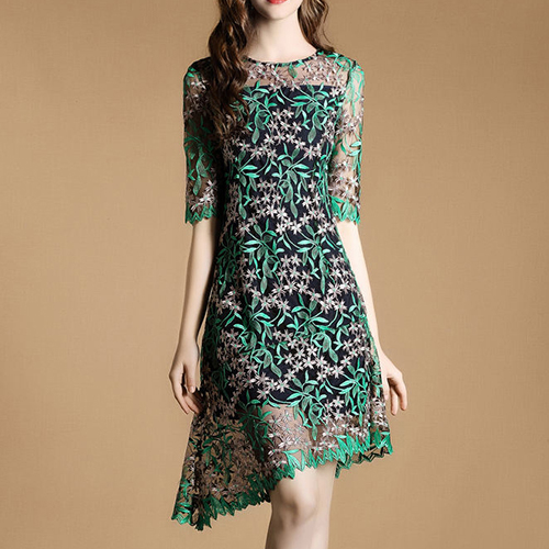 It is outfitted with half sleeve,round neck,an oblique hem and a sleek silhouette,refined and elegant. Plus,its embroidered