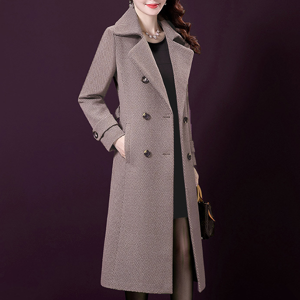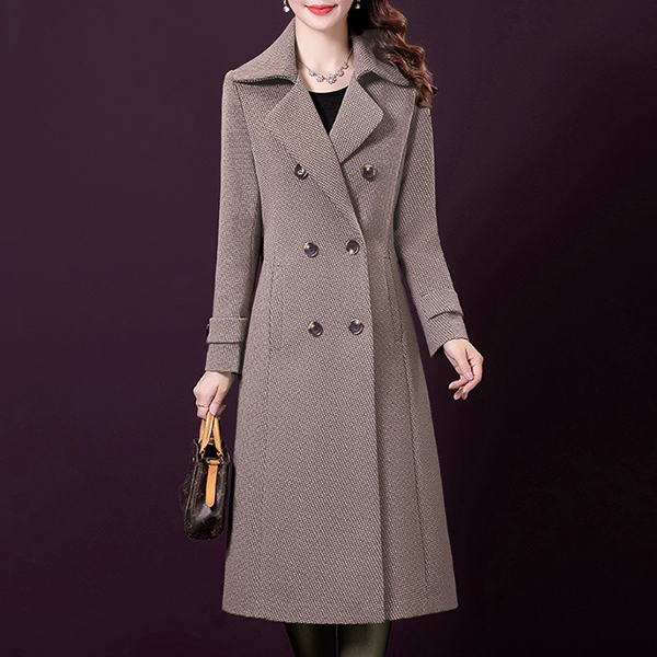 Elegant Style Long Sleeve Double-breasted Slim Fit Houndstooth Woolen Coat with Waist Strap
