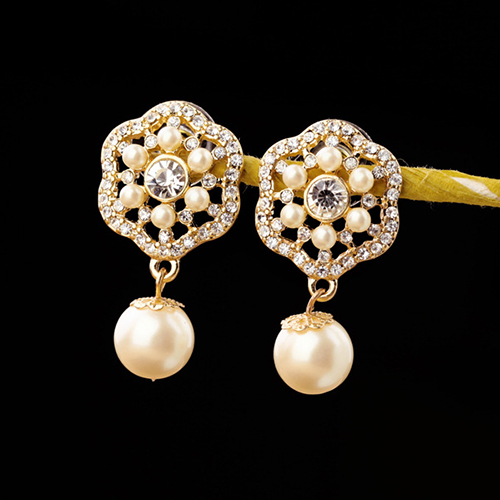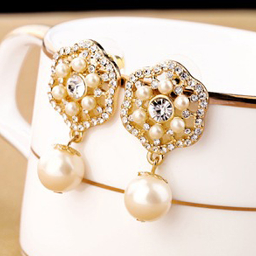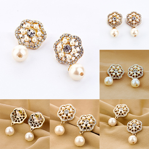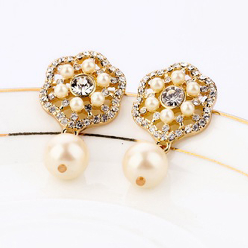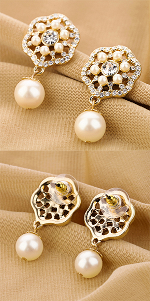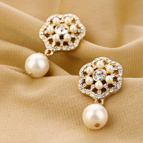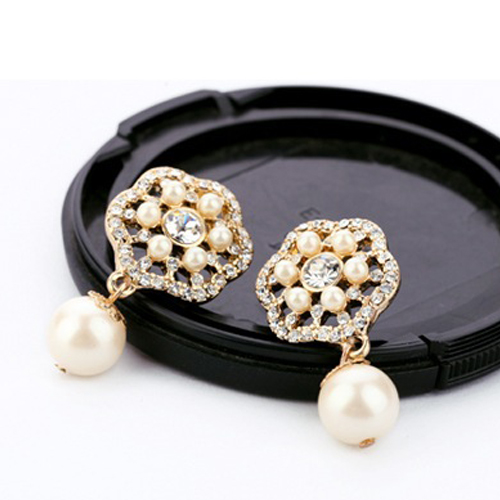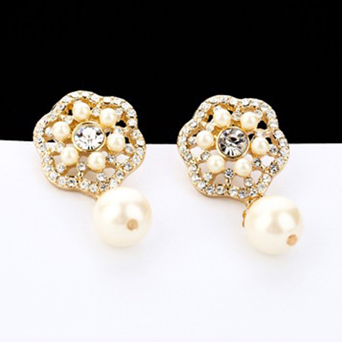 Elegant Style Rhinestone Hollow Out Flower-Shaped Pearl Pendant Earrings
