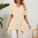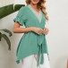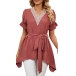 This Shirt is the perfect combination of sophistication and style. It features delicate Swiss-dot and lace detailing on the V-neck and irregular hemline, adding a touch of elegance to the overall design. And the self-tie waist adds a flattering silhouette. The irregular hemline adds a unique and stylish touch to the shirt, making it perfect for shorts, jeans or skirt!