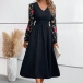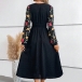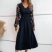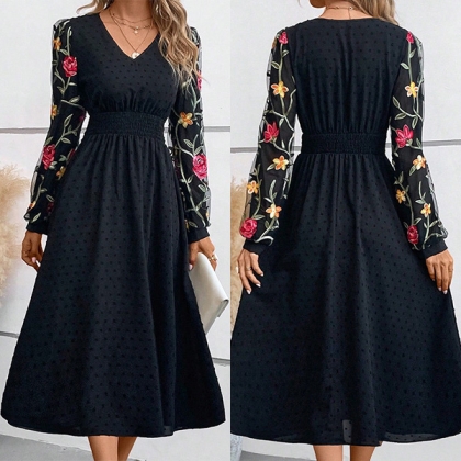 Elegant Swiss-dot V-neck Floral Embroidered Long Sleeve High-rise Midi Dress