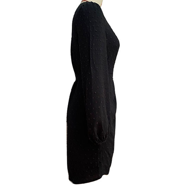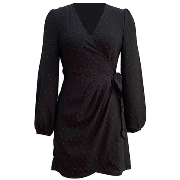This wrap dress exudes a graceful charm with its Swiss-dot pattern, creating a delicate and feminine look. It radiates timeless elegance and is sure to make a lasting impression.