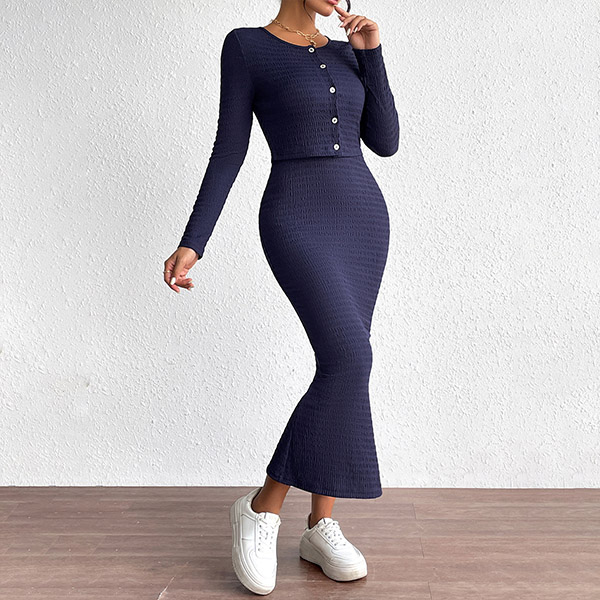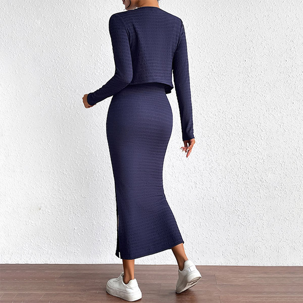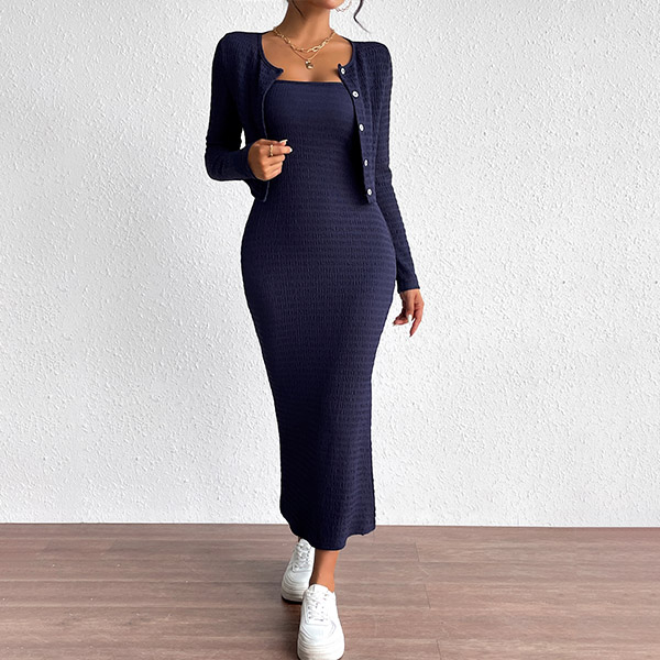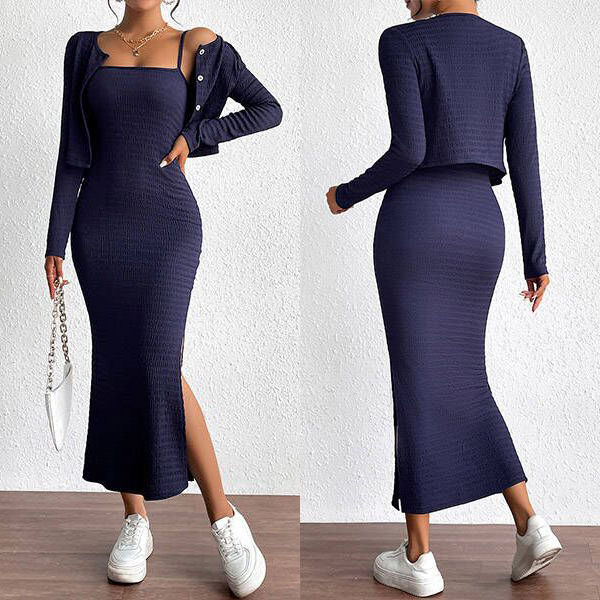 This dress set is the epitome of sophistication and style. The knitted fabric adds a cozy and luxurious feel, perfect for cooler weather. The cardigan features a classic design with a button-down front and long sleeves, providing warmth and versatility. The dress also features a stylish side slit, adding a touch of allure and elegance. Made from high-quality fabric, this two-piece dress set is not only fashionable but also comfortable and durable.