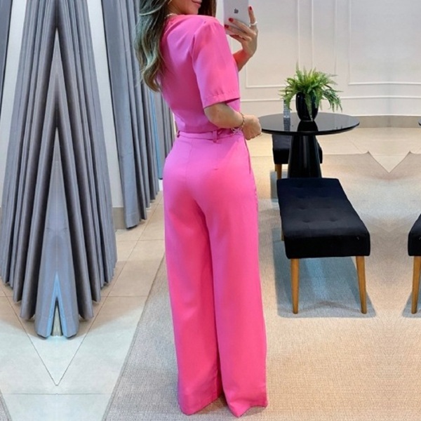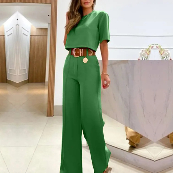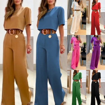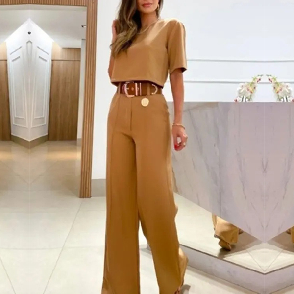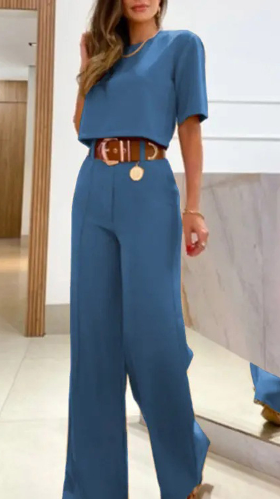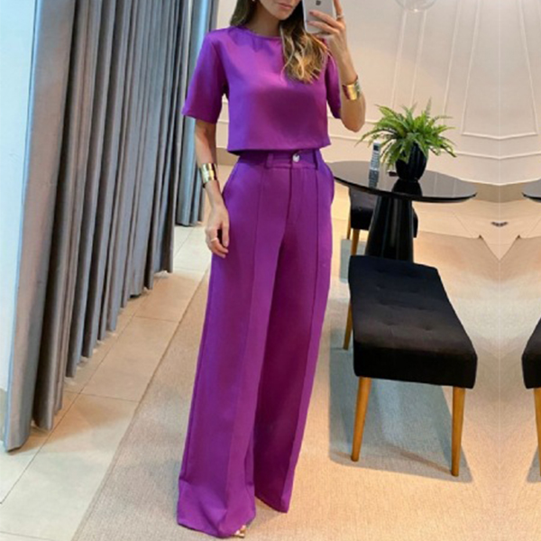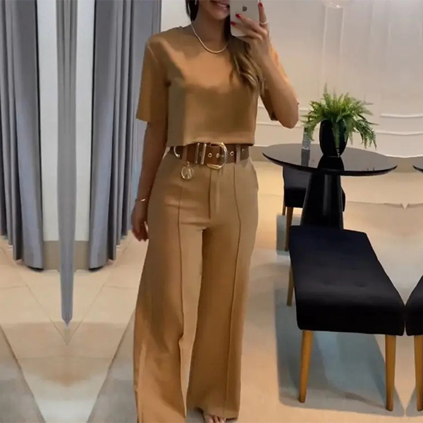 Elegant Two-piece Set Consist of Crop Shirt and Straight-cut Pants (without Belt)