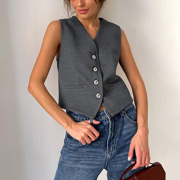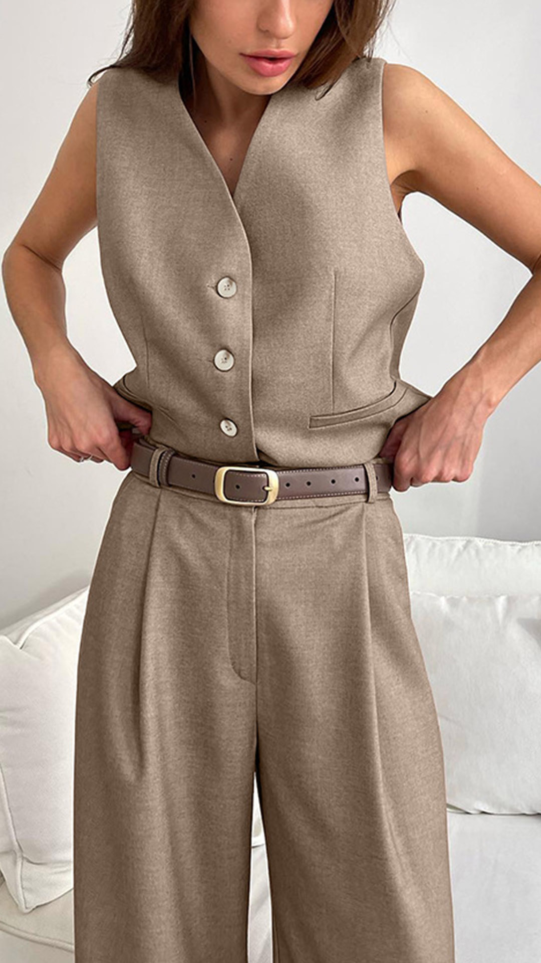 This Two-piece Suit Set consists of a sleeveless vest and straight-cut pants for an elegant and polished look. The sleeveless vest features a tailored fit and a front button, exuding a sense of refinement and sophistication. The straight-cut pants provide a sleek and streamlined silhouette. Crafted with high-quality fabric, this suit set offers both style and comfort.