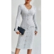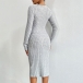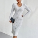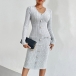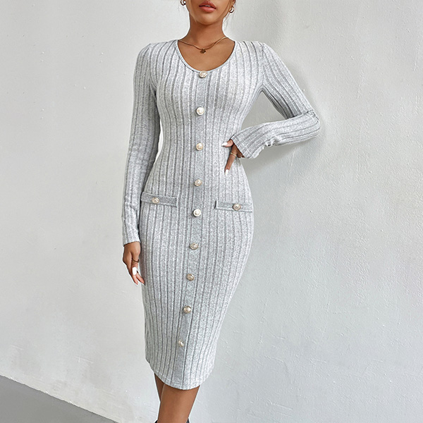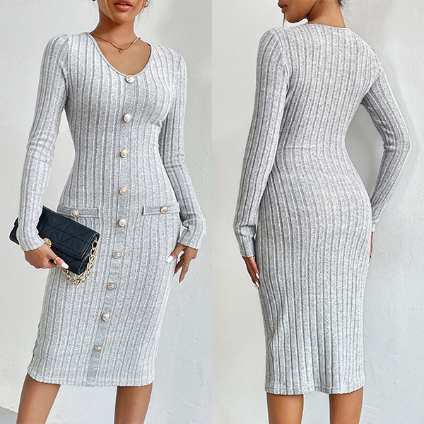 Elegant V-neck Buttoned Long Sleeve Ribbed Dress