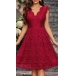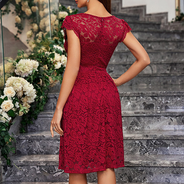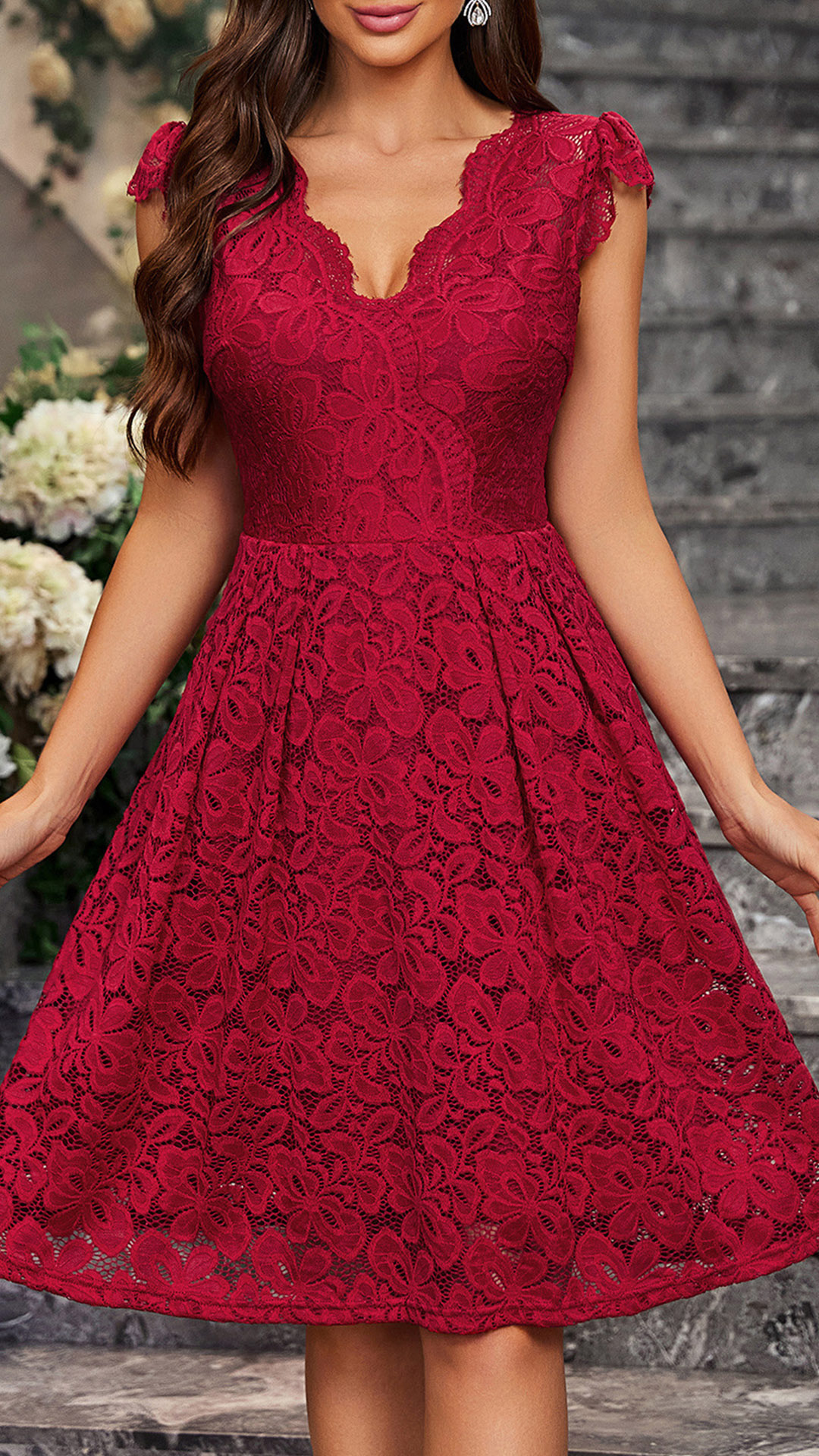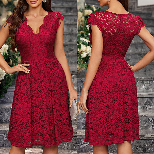 This elegant red dress features a V-neckline, cap sleeves, high-rise waist, and jacquard lace detailing, creating a sophisticated and chic look. Pair it with heels and a clutch for a formal event or dress it down with sandals for a more casual affair.