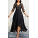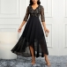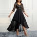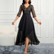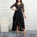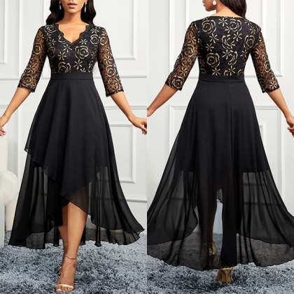 Elegant V-neck Elbow Sleeve Floral Lace Spliced Chiffon Irregular Hemline Party Dress