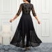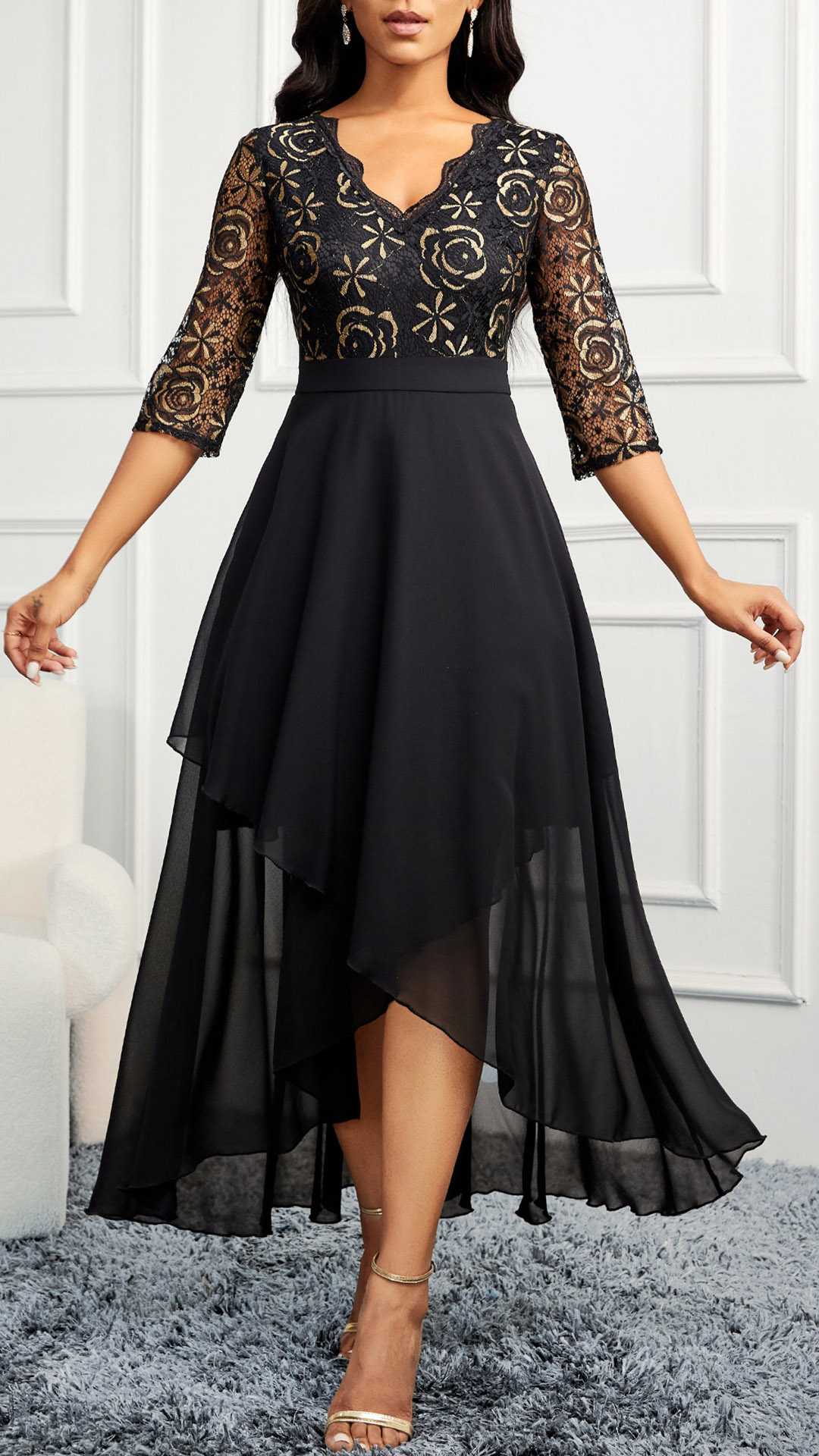 This exquisite and sophisticated dress features a V-neckline, elbow-length sleeves, a floral lace overlay bodice spliced with a chiffon skirt and an irregular hemline. Perfect for next party!