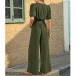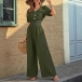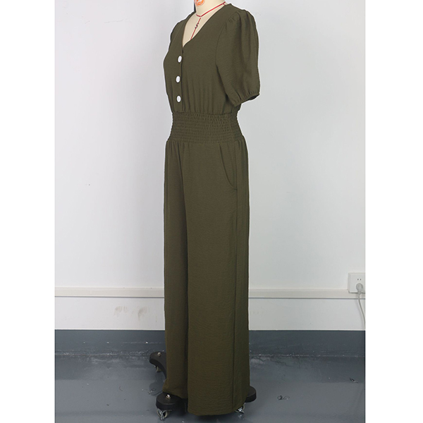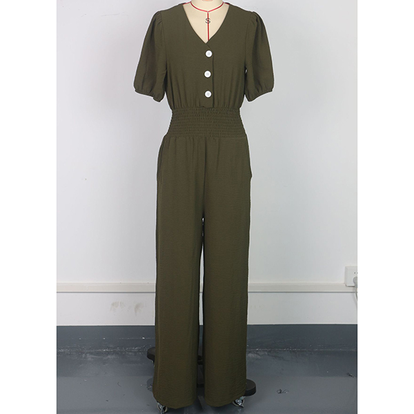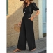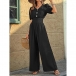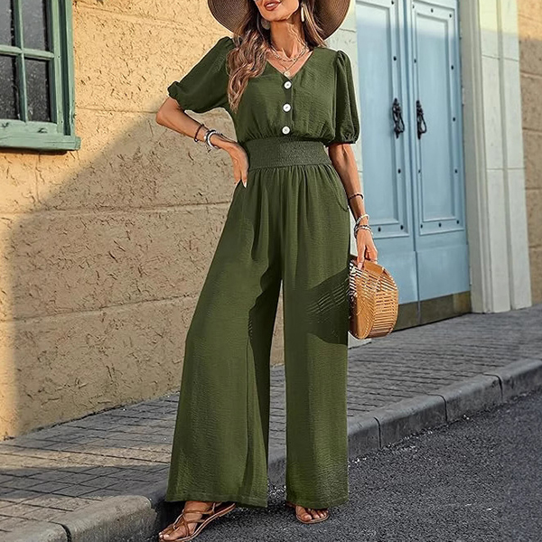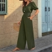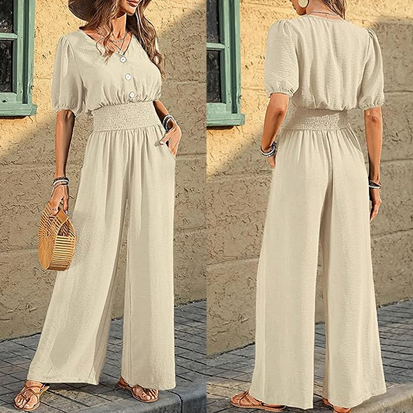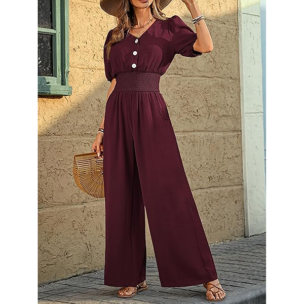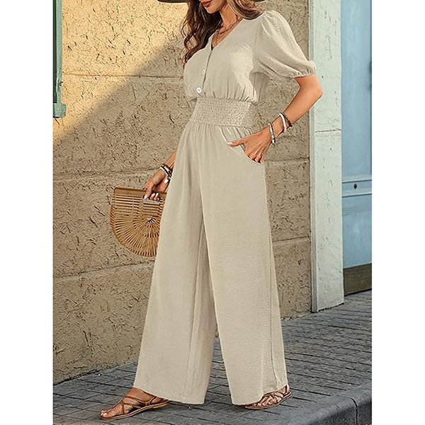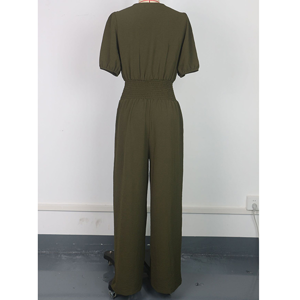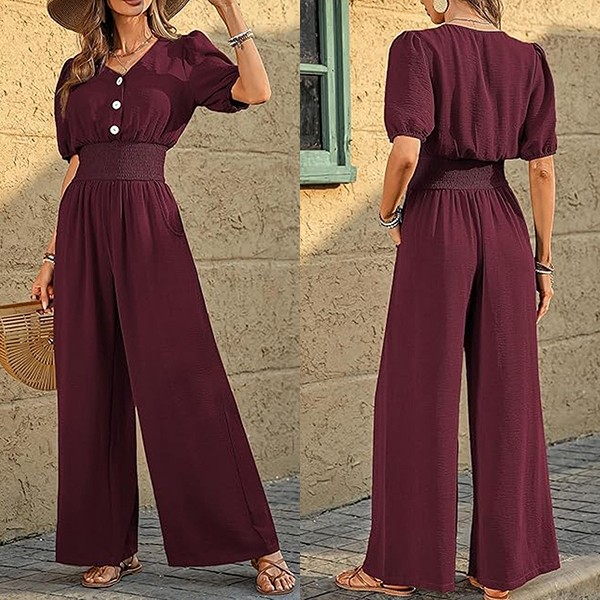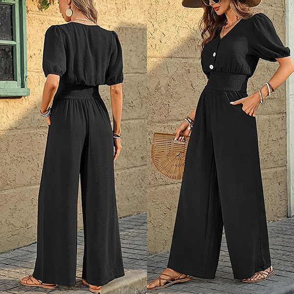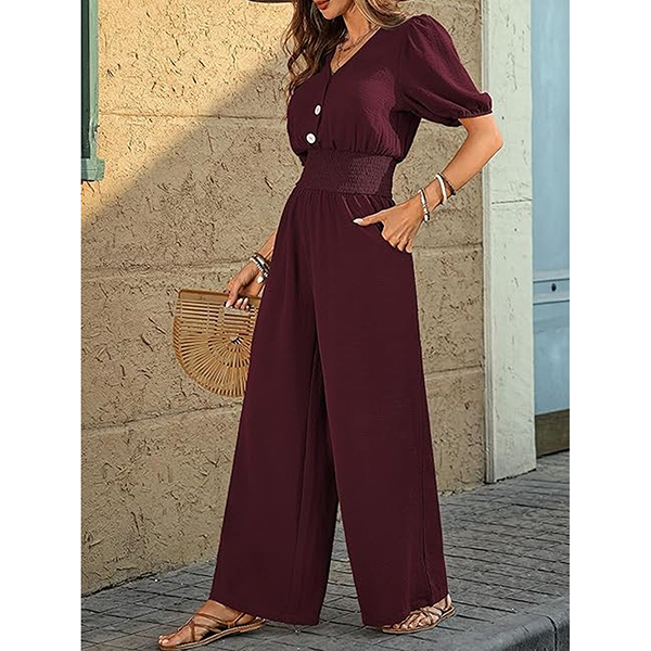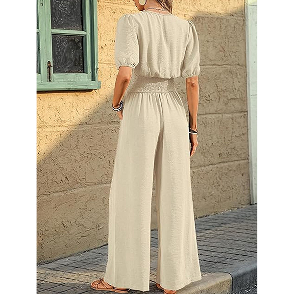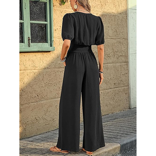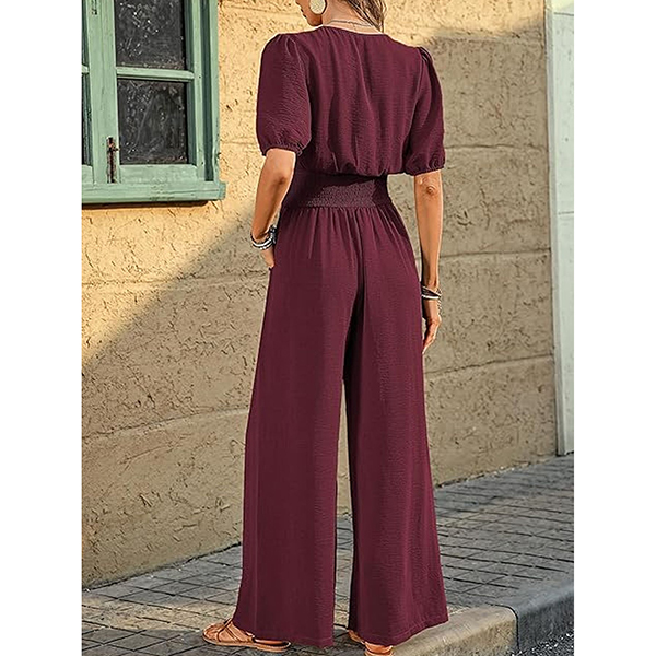 Elegant V-Neck Jumpsuit - Short Sleeve Wide-Leg Design with Cinched Waist