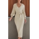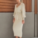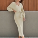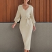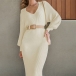 Elegant V-Neck Lantern Long Sleeve Self-tie Knitted Sweater Dress