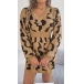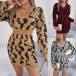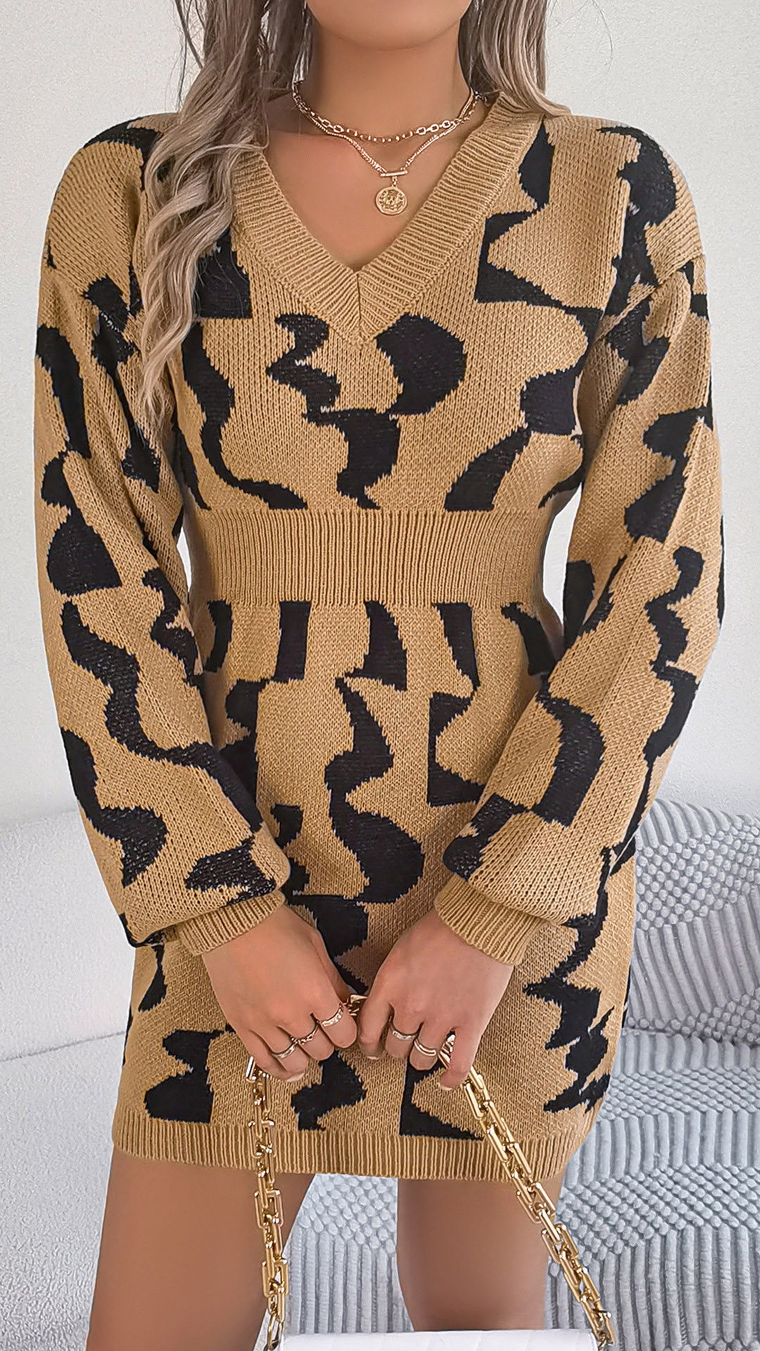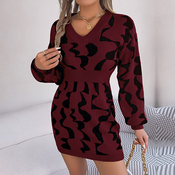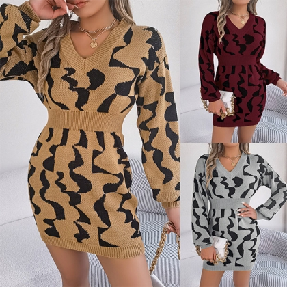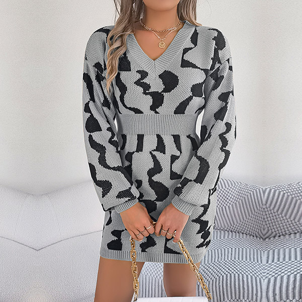 Elegant V-neck Long Sleeve Contrast Color Pattern Knitted Sweater Dress