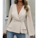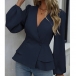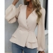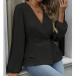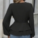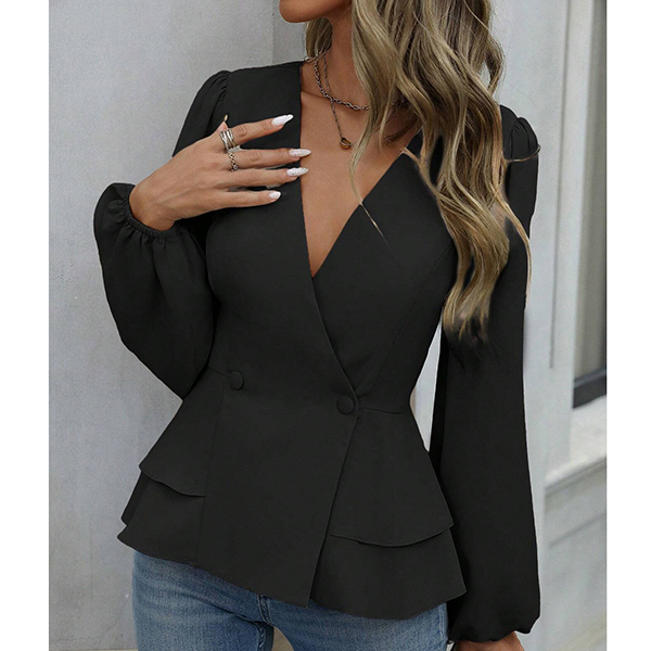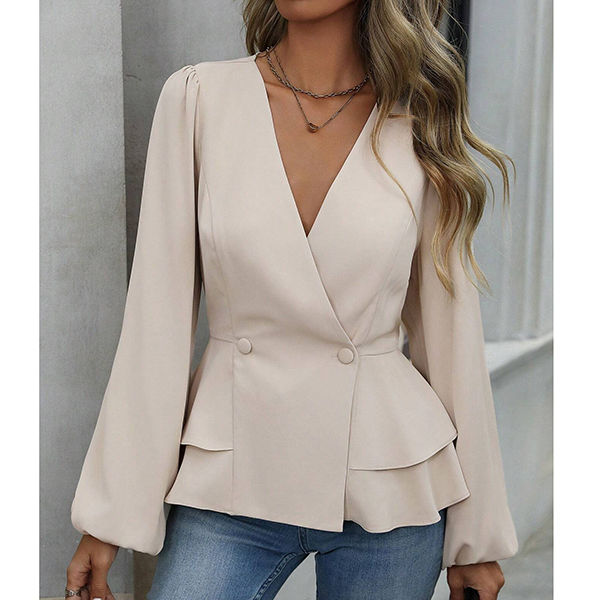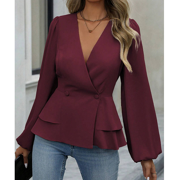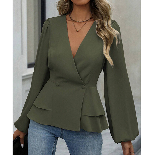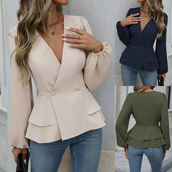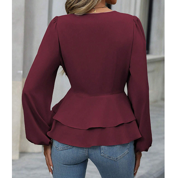 Elegant V-neck Long Sleeve Double-breast Cinch Waist Ruffle Hemline Shirt