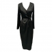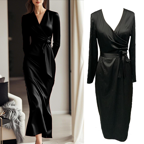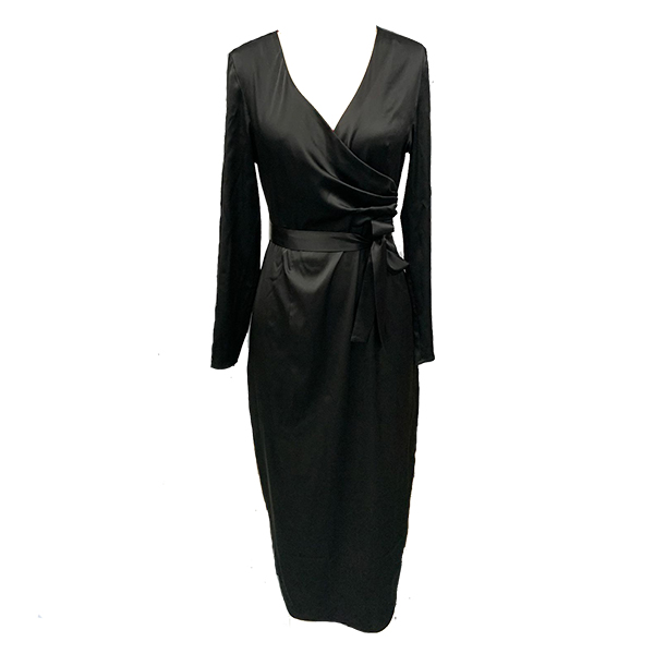 This elegant dress features graceful V-neck styling with adjustable self-tie detailing and luxurious satin construction for contemporary refined elegance. Perfect for elegant occasions, sophisticated styling, or luxurious formal coordination.