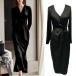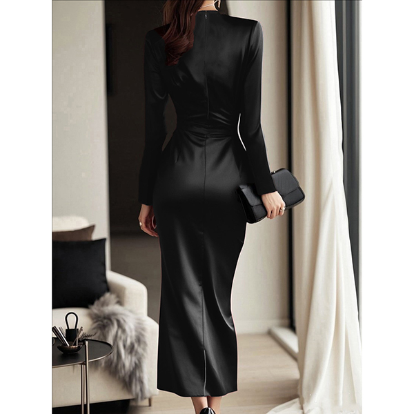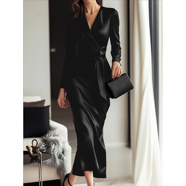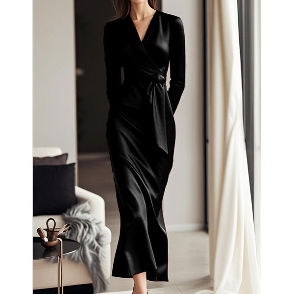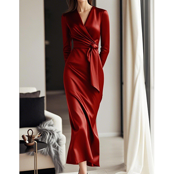 Elegant V-neck Long Sleeve Self-tie Satin Dress