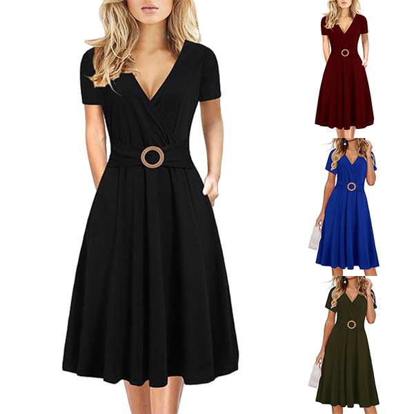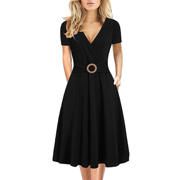 Elegant V-neck Short Sleeve Cinch Waist Dress