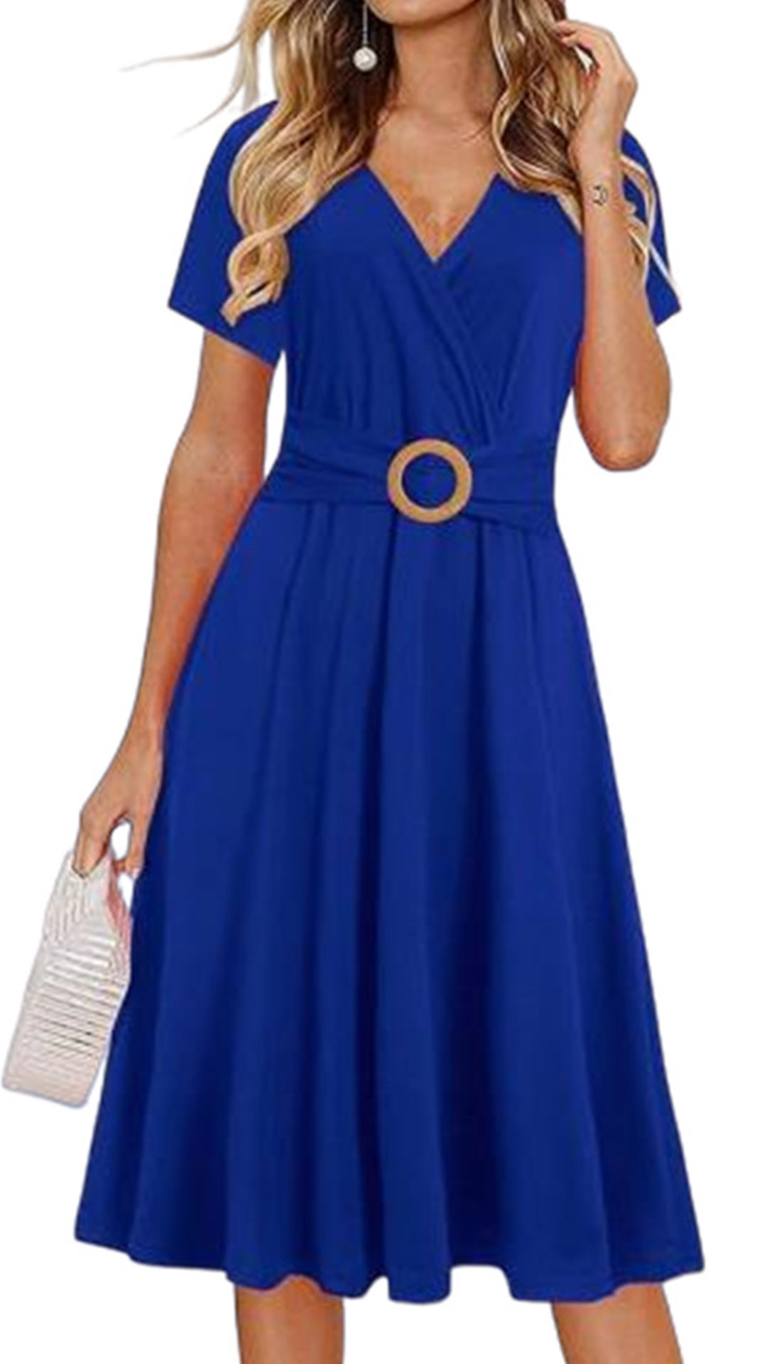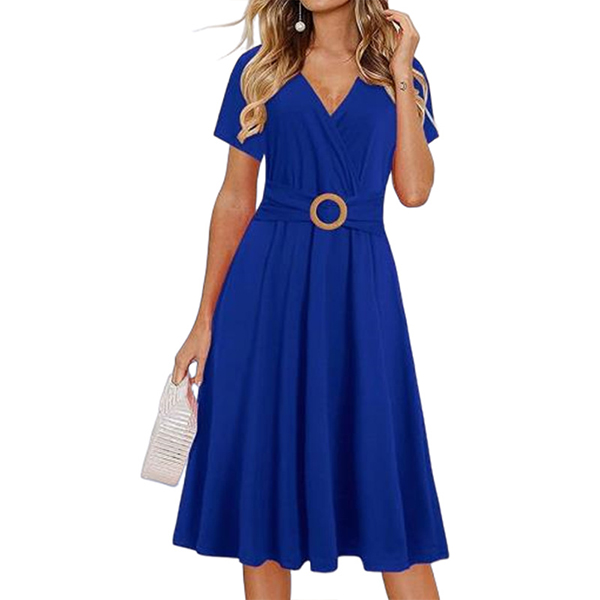 This elegant dress features a V-neckline, short sleeves, and a cinched waist for an elegant and feminine look. Pair it with heels and statement accessories for a polished and put-together look.
