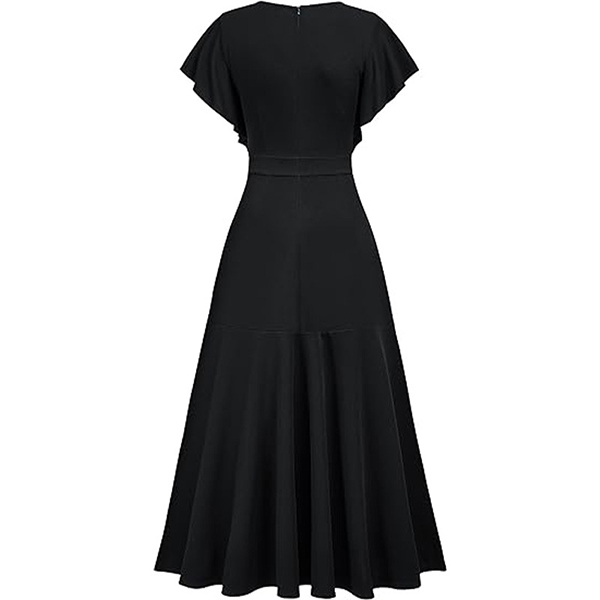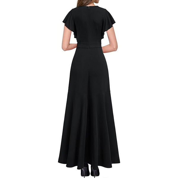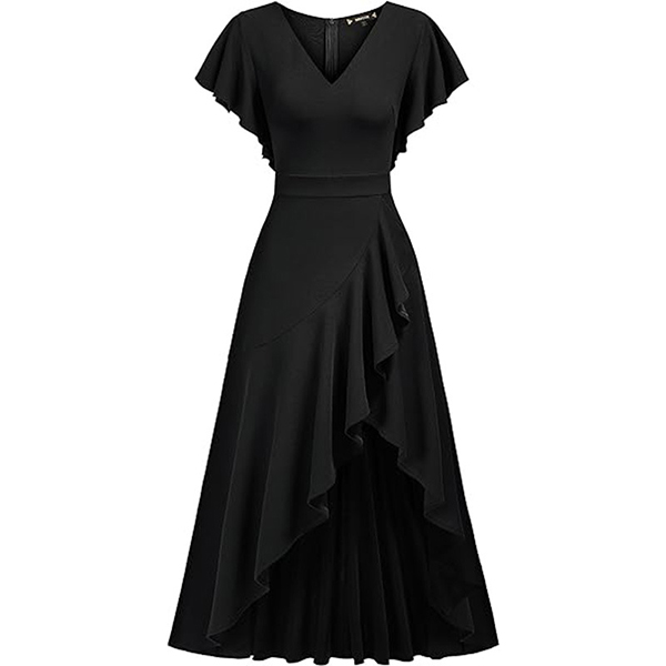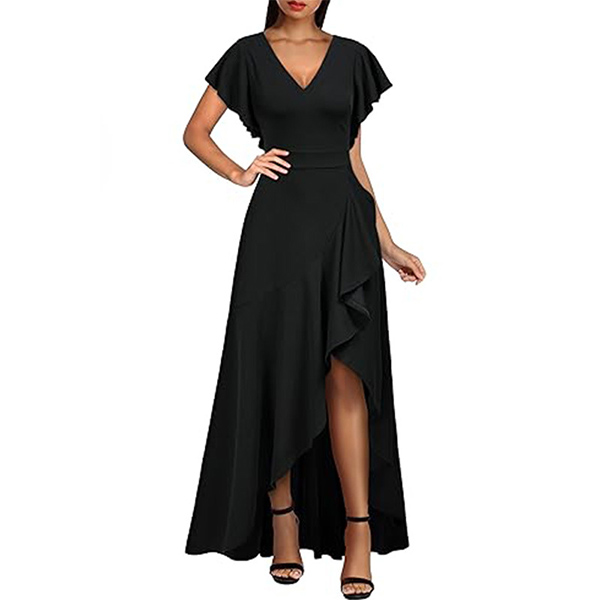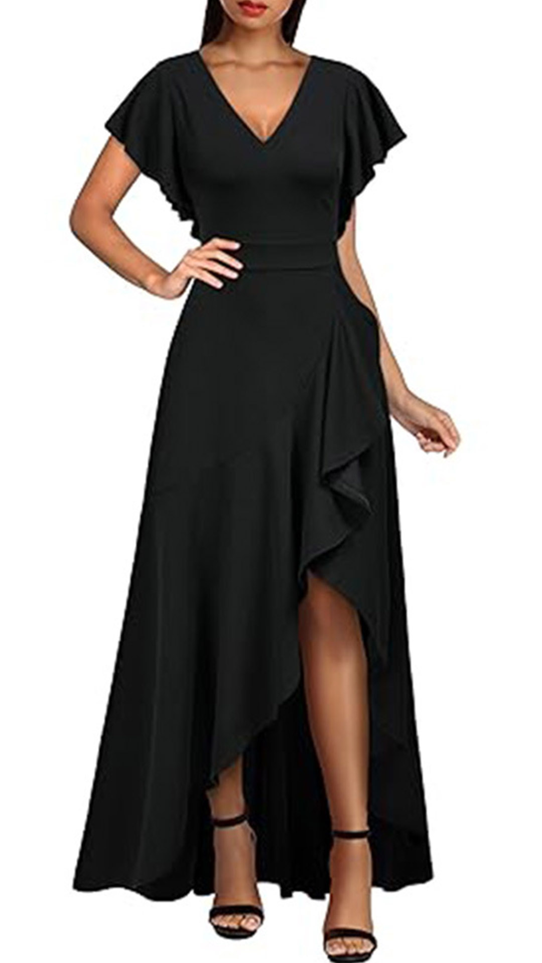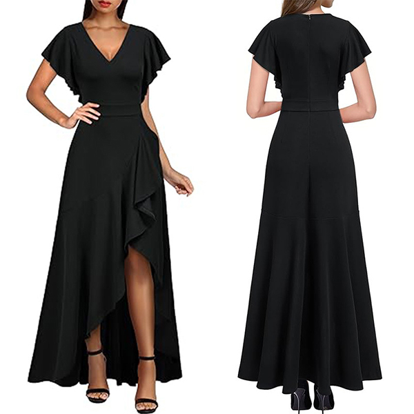 This black dress features a flattering V-neckline, delicate short sleeves, a high rise waist, an irregular hemline with ruffle and slit design, creating a stunning and glamorous look. It is perfect choice for any special occasion.