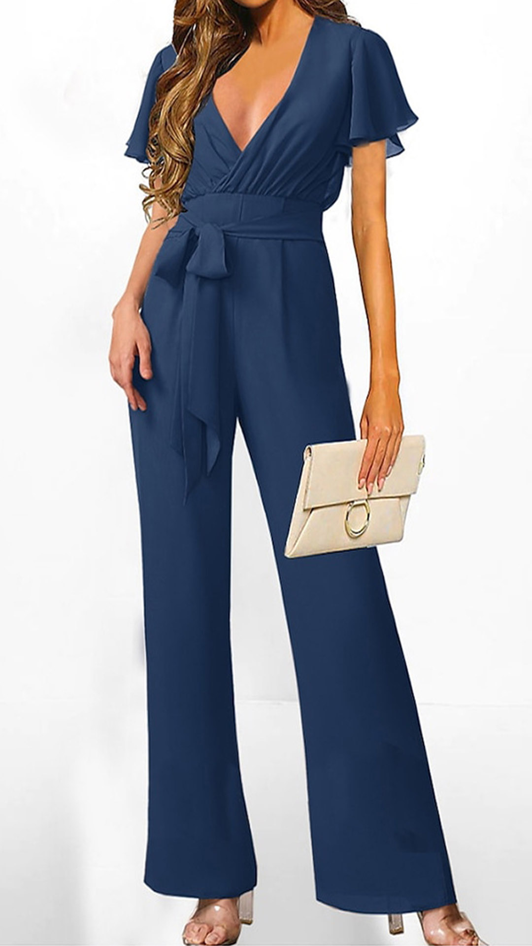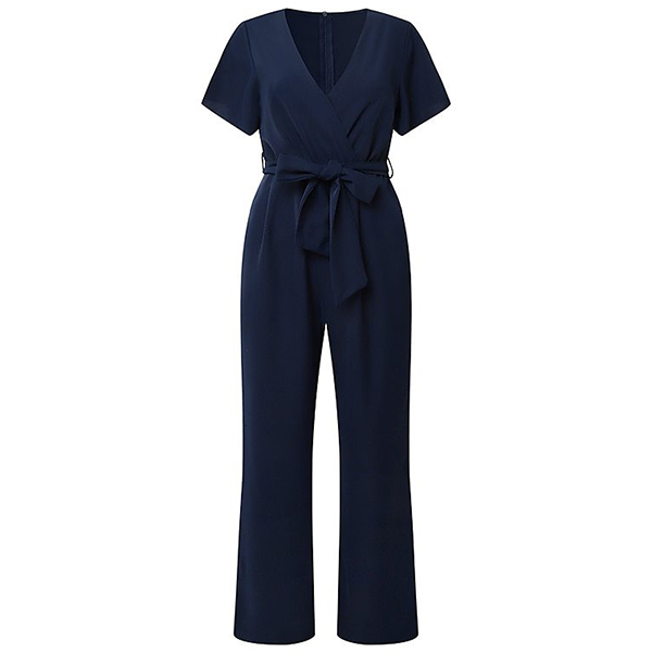 This jumpsuit features a flattering V-neckline, short sleeves, and a self-tie waist belt, creating a chic and polished look. Crafted from high-quality and flowy materials, this jumpsuit ensures both comfort and style.