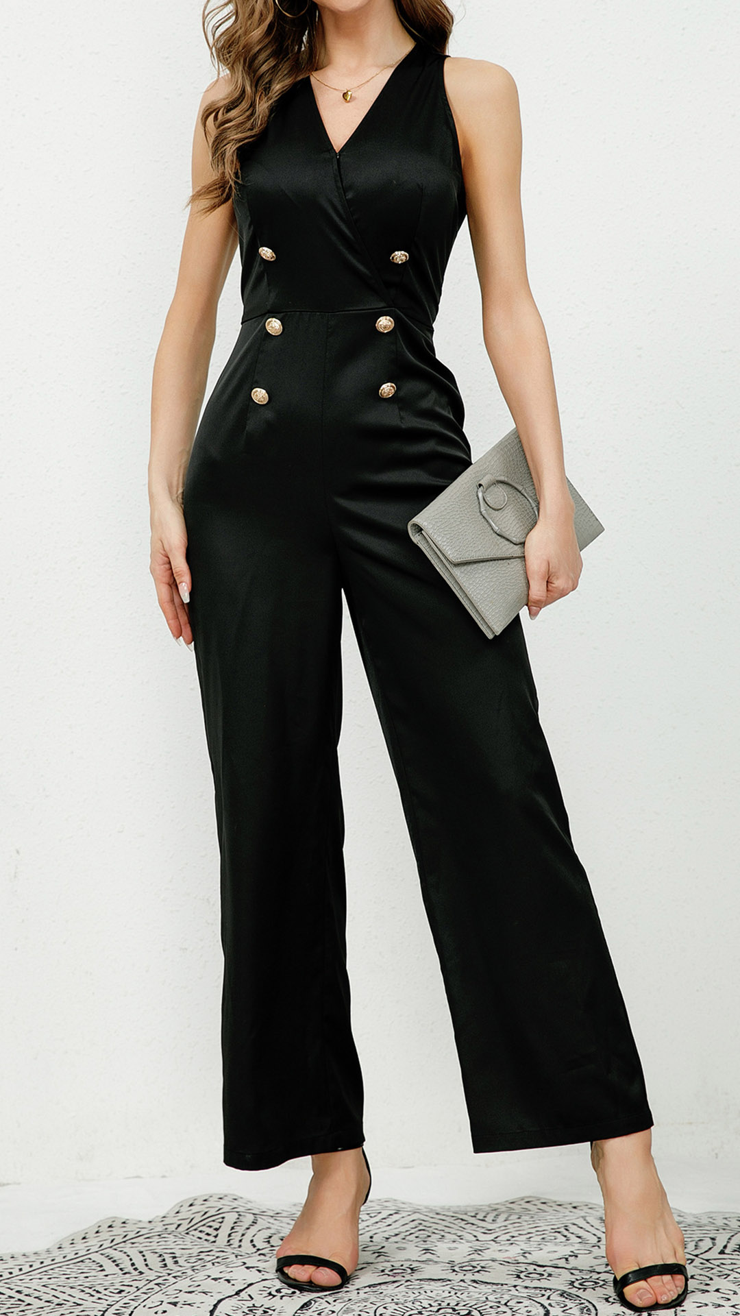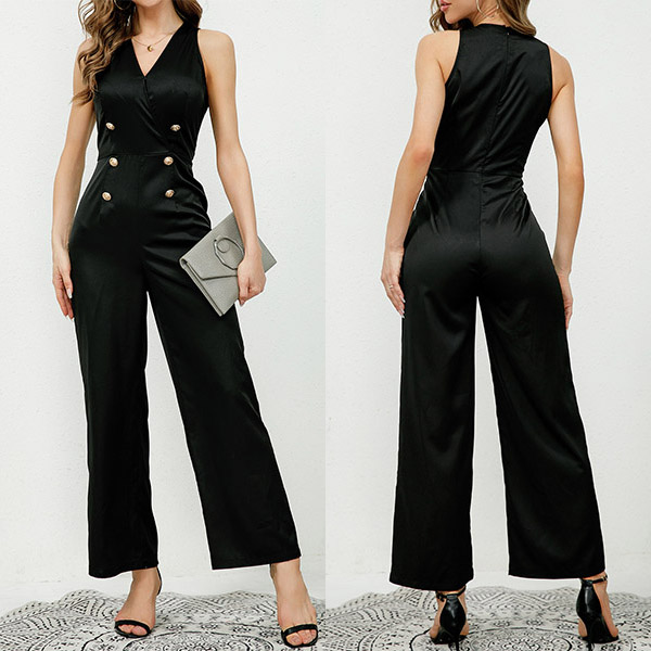 This jumpsuit features a V-neckline, sleeveless design, double-breasted detailing, and wide-leg pants for an elegant and stylish look.