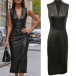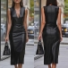 Elegant V-neck Sleeveless High-rise Artificial Leather PU Bodycon Dress