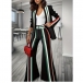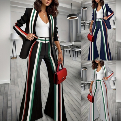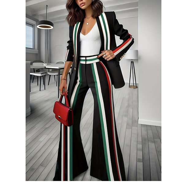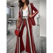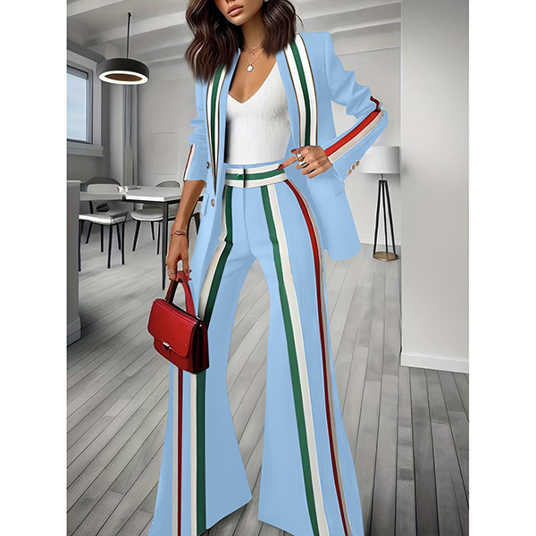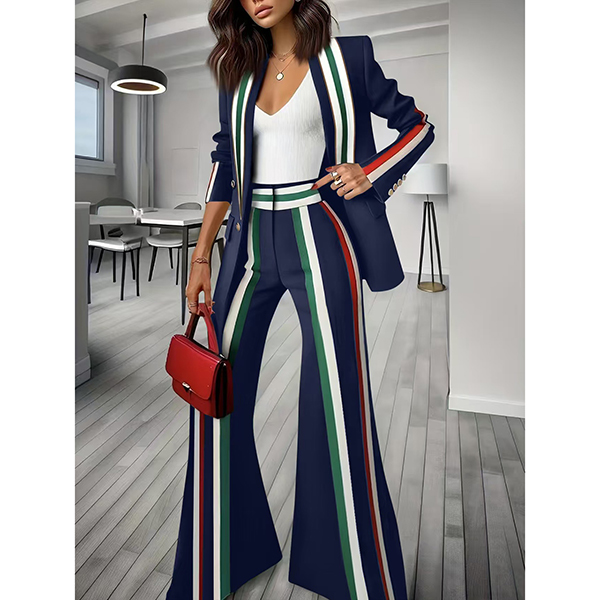 Elegant Vertical Stripe Printed Two-piece Set Consist of Blazer and Wide-leg Pants