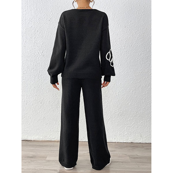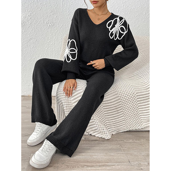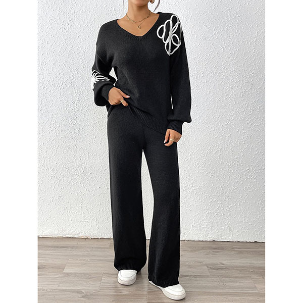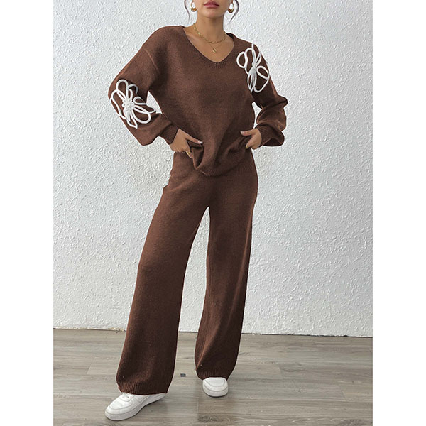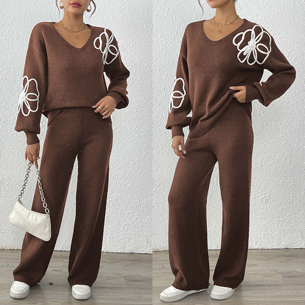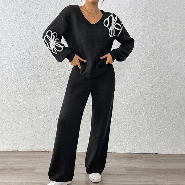 Embroidered Two-Piece Set with V-Neck Sweater and Straight Pants