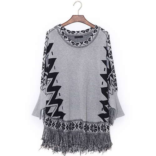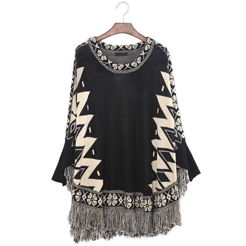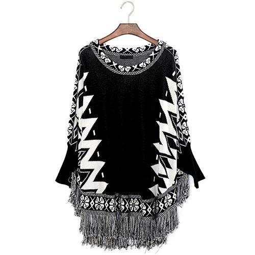 Obviously,you will attracted by this ethnic customs sweater at your first sight. Cape-style design,with ethnic floral print pattern,bat sleeve,hemline with tassels design,unique and chic.