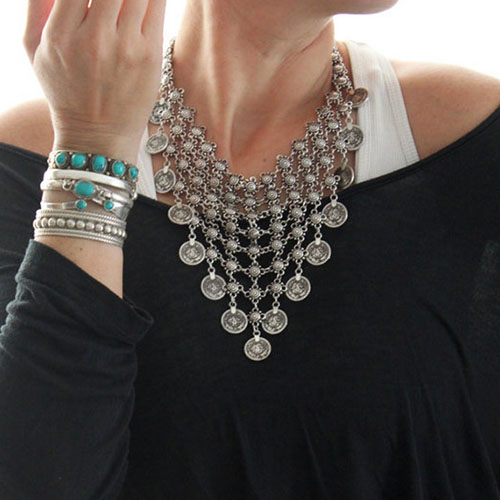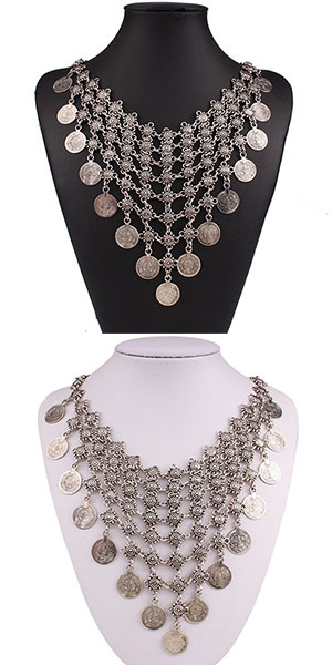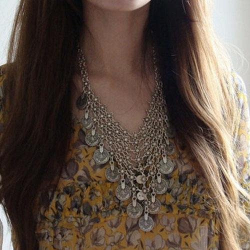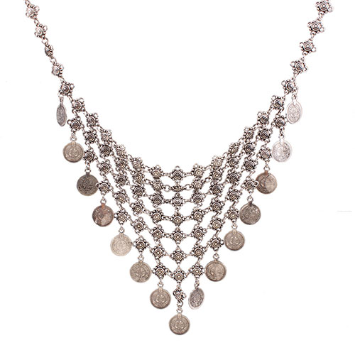 Match this pretty necklace with your favorite dress and boots for a glamorous look. Its coins