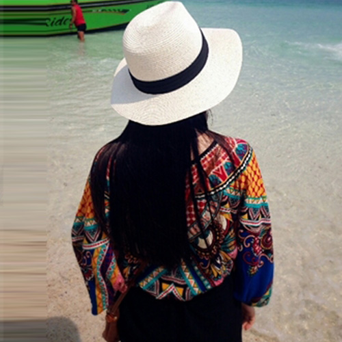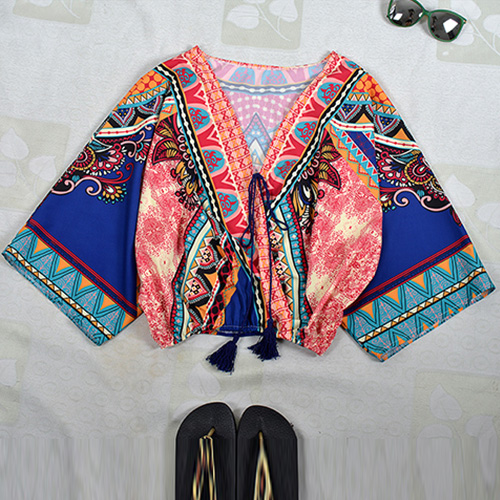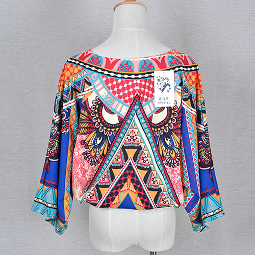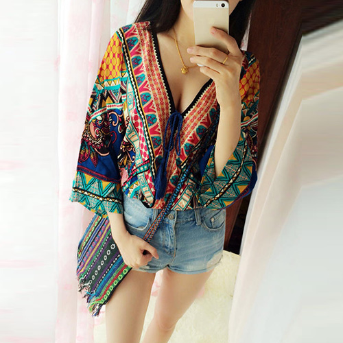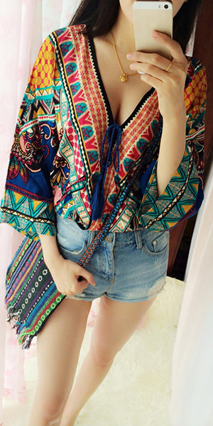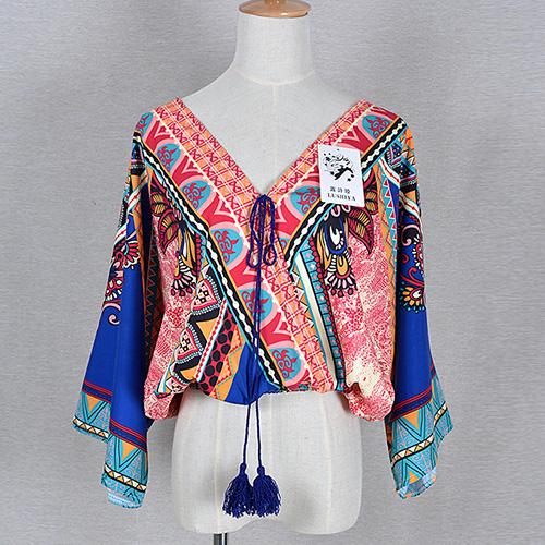 Ethnic Style Floral Print V-neck Bat Sleeve Loose Tops